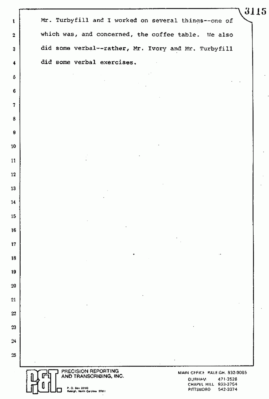 A During an area of time when Mr. Shaw and Mr. Chamberlain were processing a particular part of the building in which we could not get into, Mr. Ivory and Mr. Turbyfill and I worked on several things -- one of which was, and concerned, the coffee table. We also did some verbal -- rather, Mr. Ivory and Mr. Turbyfill did some verbal exercises.