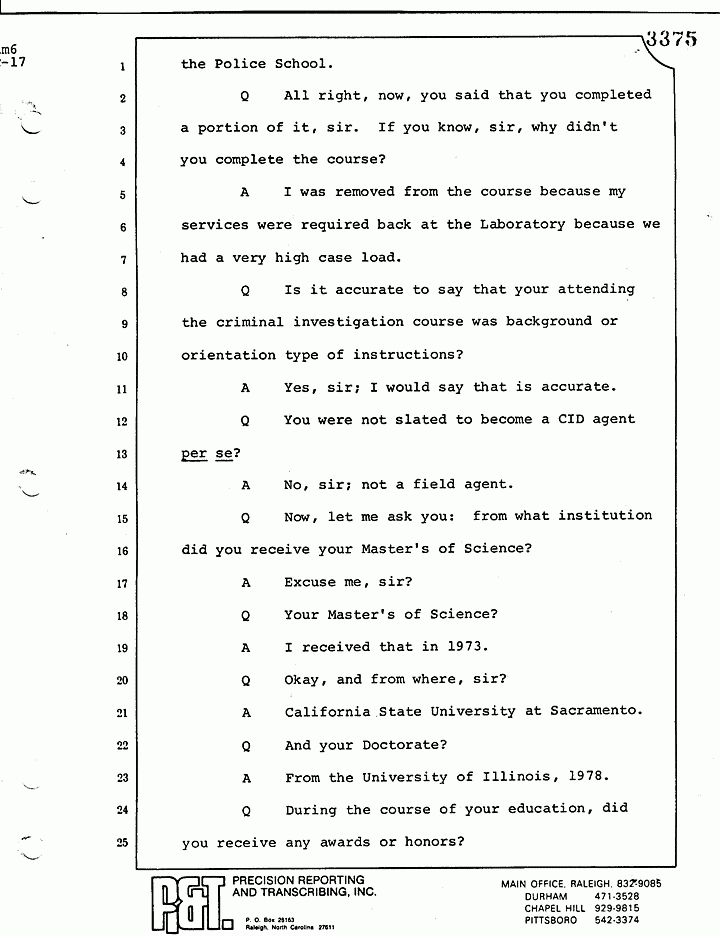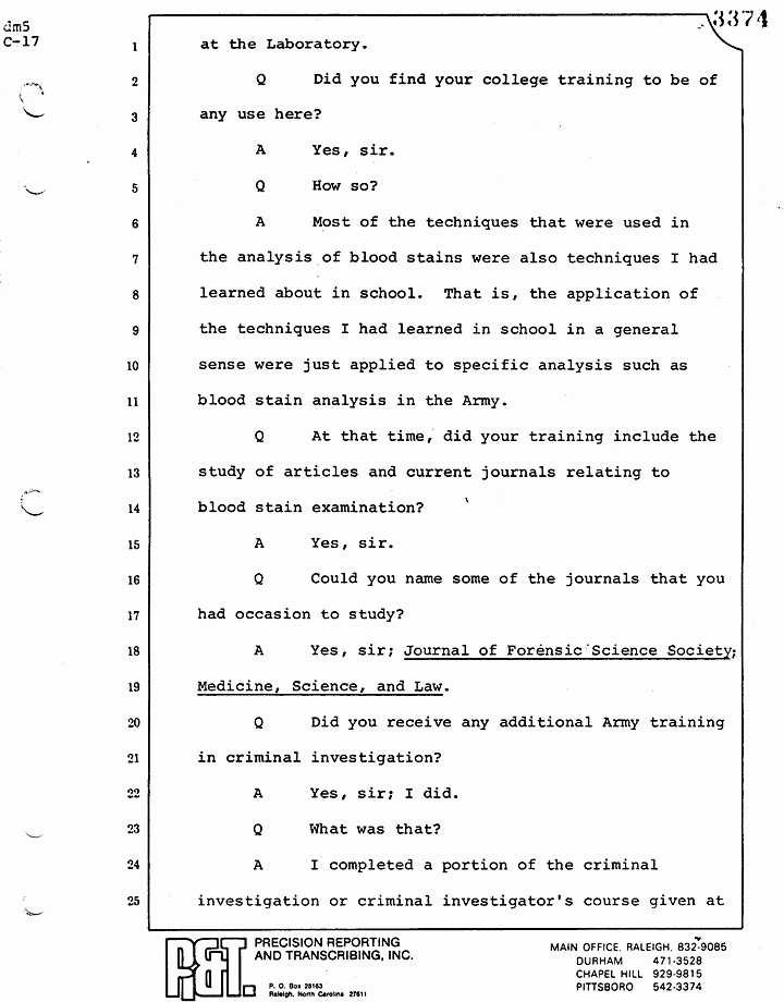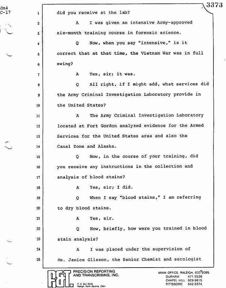 A Most of the techniques that were used in the analysis of blood stains were also techniques I had learned about in school. That is, the application of the techniques I had learned in school in a general sense were just applied to specific analysis such as blood stain analysis in the Army.