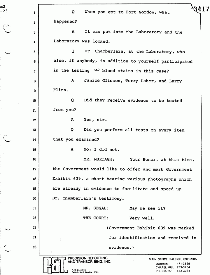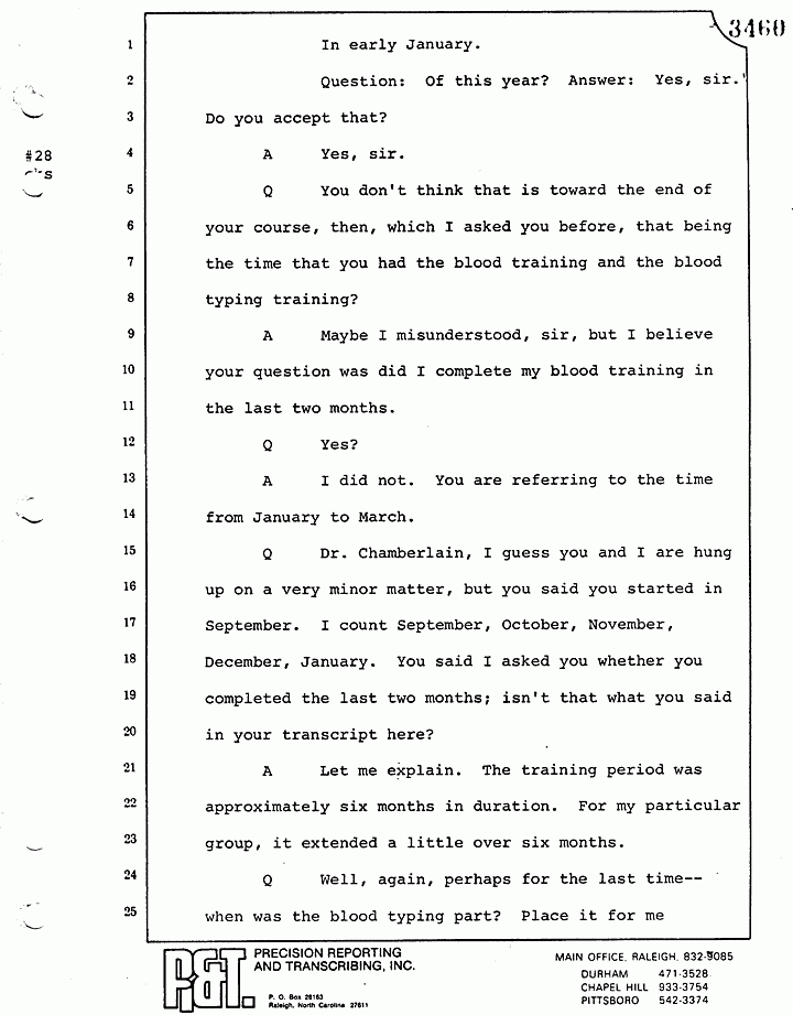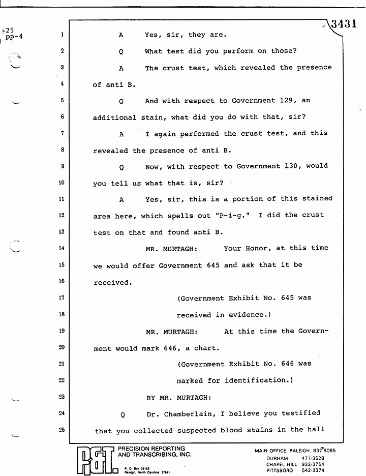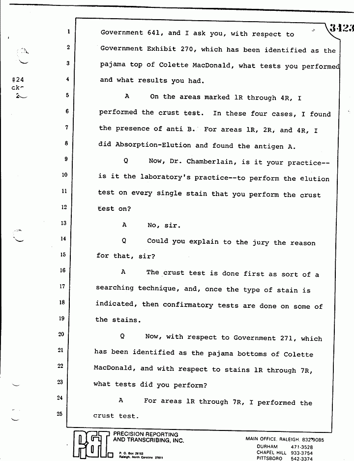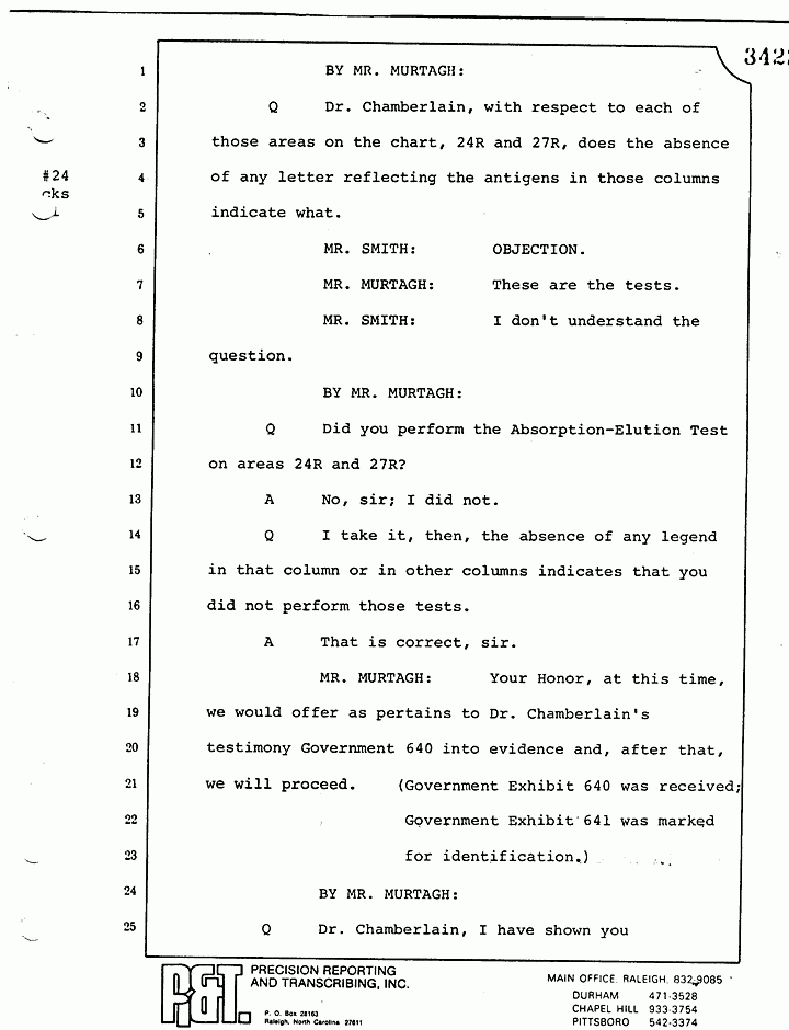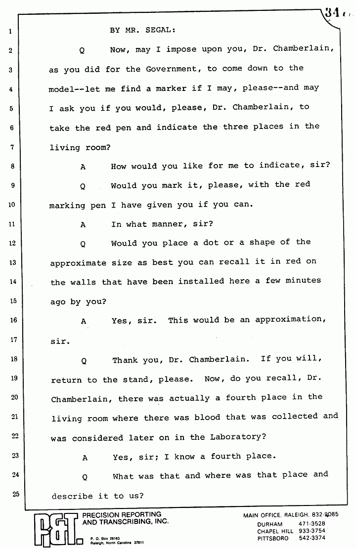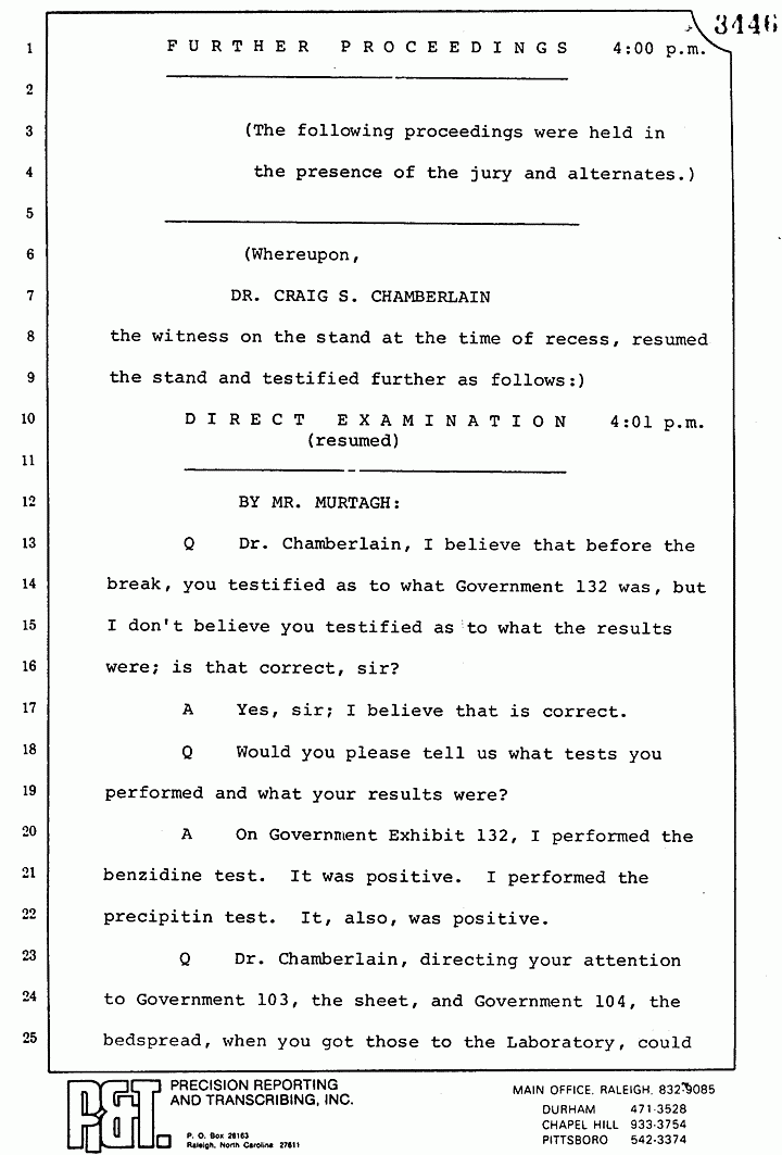Q All right, let me ask a couple of other questions. Dr. Chamberlain, there are several hundred of these tests that you performed for dried blood stains, were there not, that you participated in performing tests?