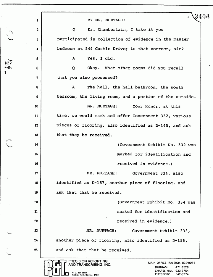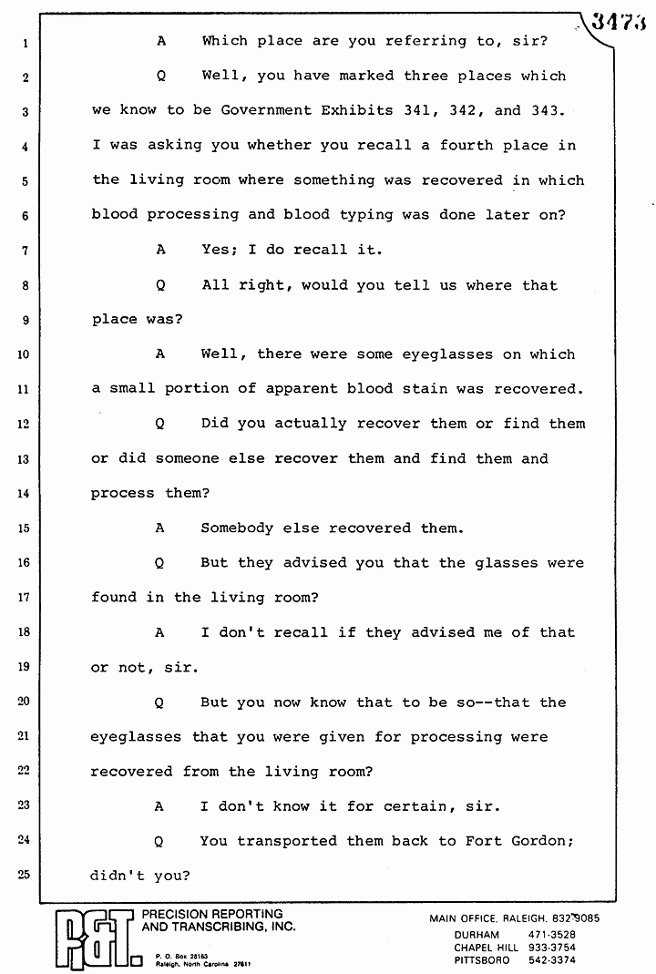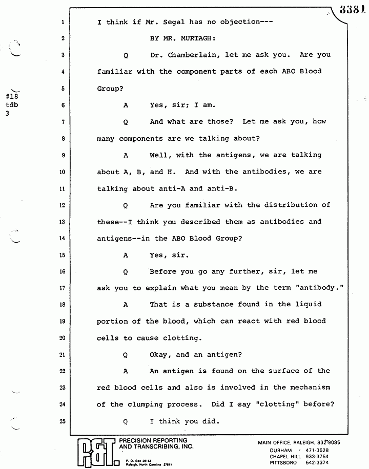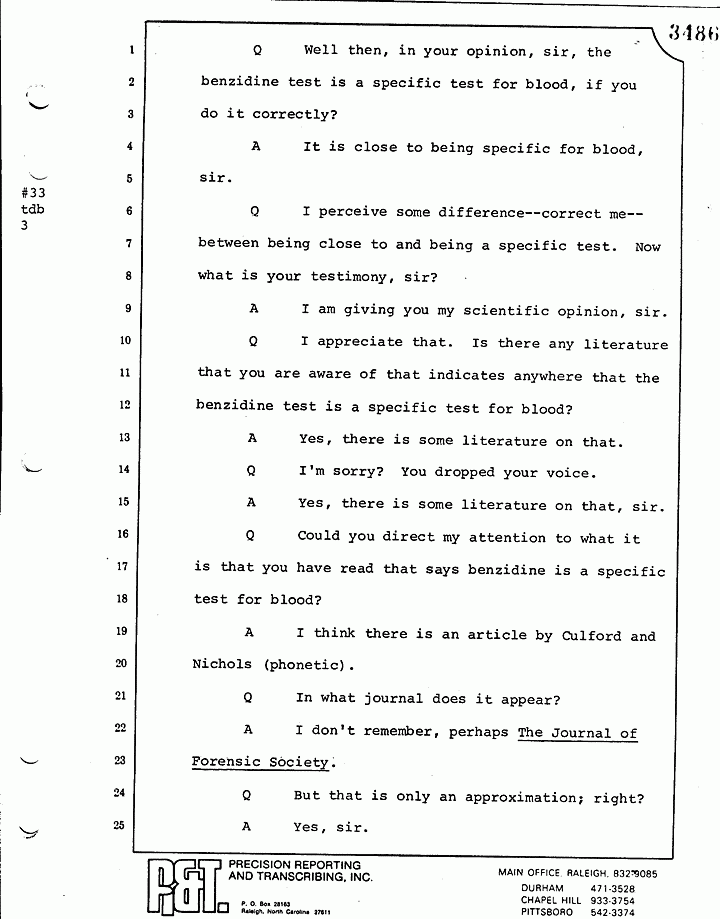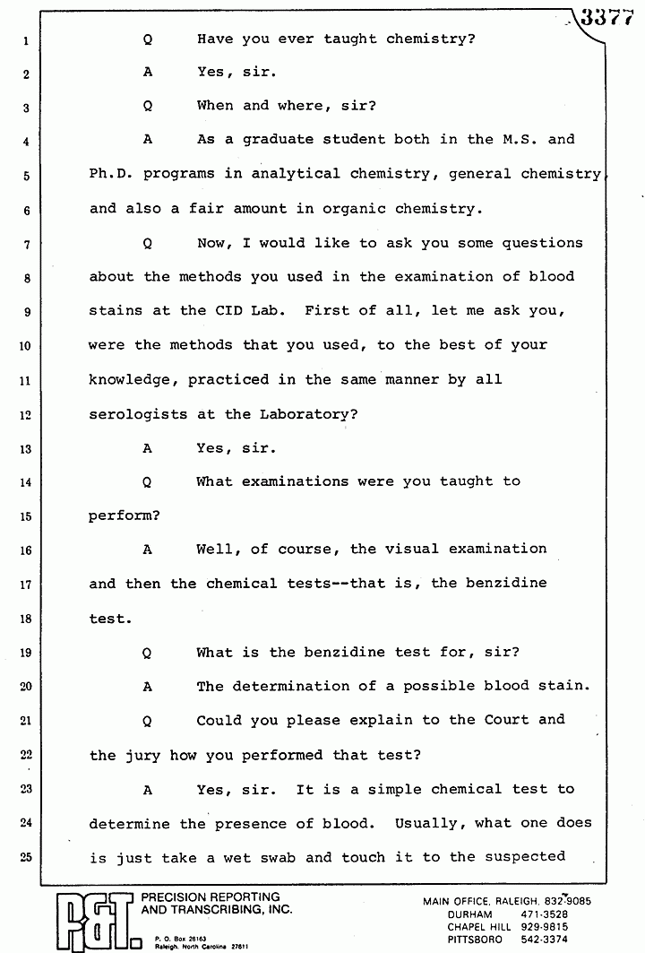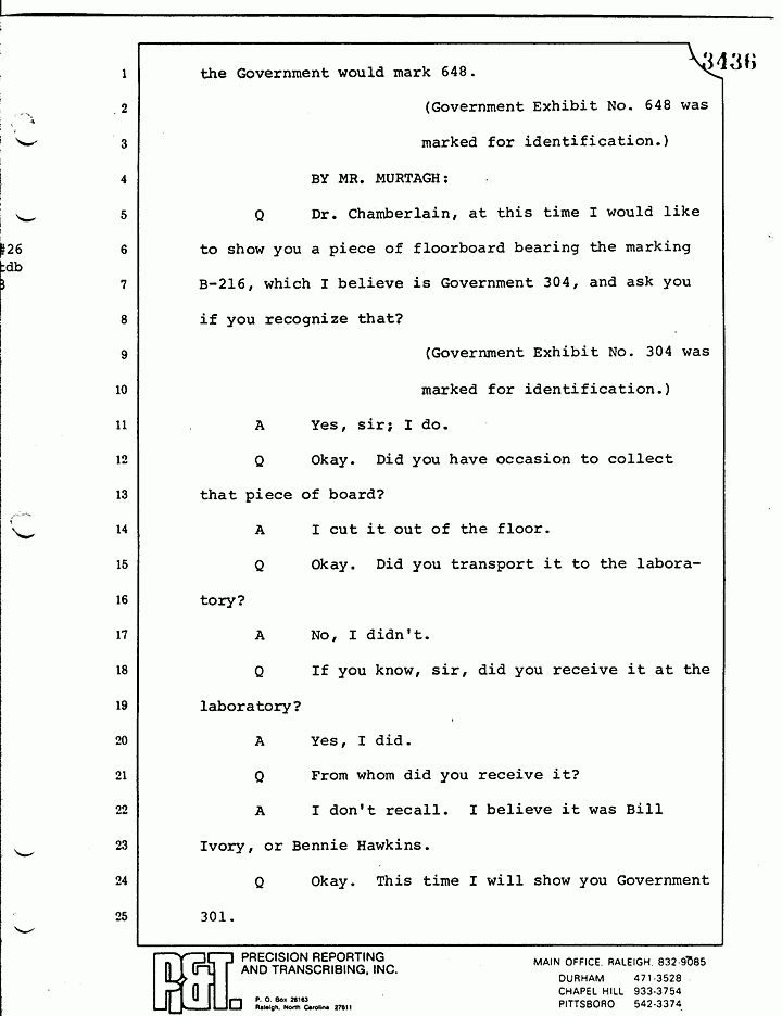 Q All right, let me ask a couple of other questions. Dr. Chamberlain, there are several hundred of these tests that you performed for dried blood stains, were there not, that you participated in performing tests?