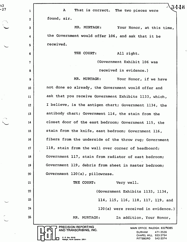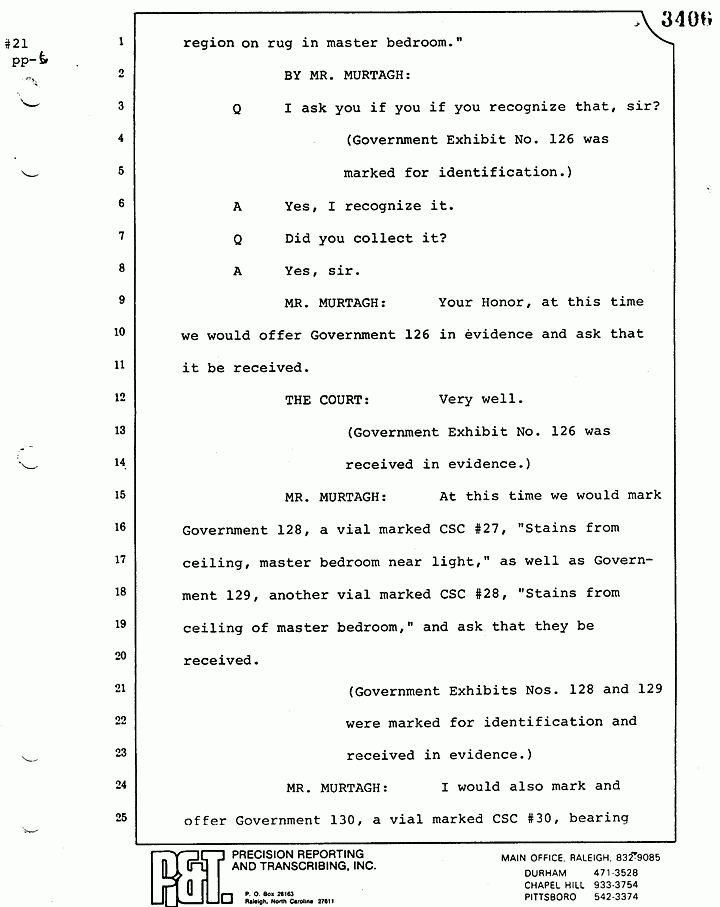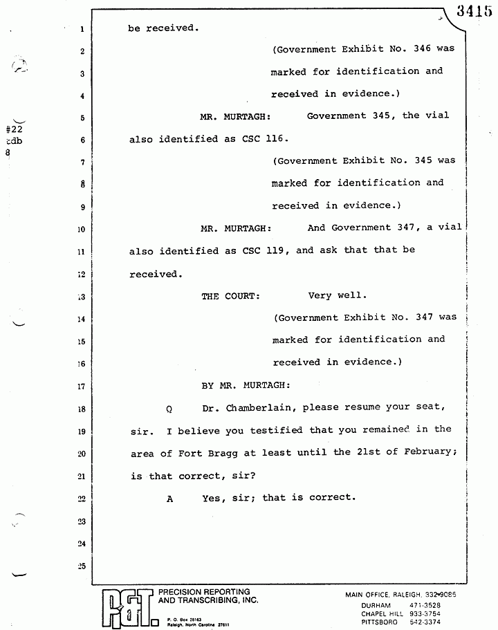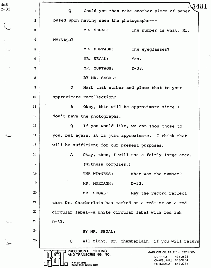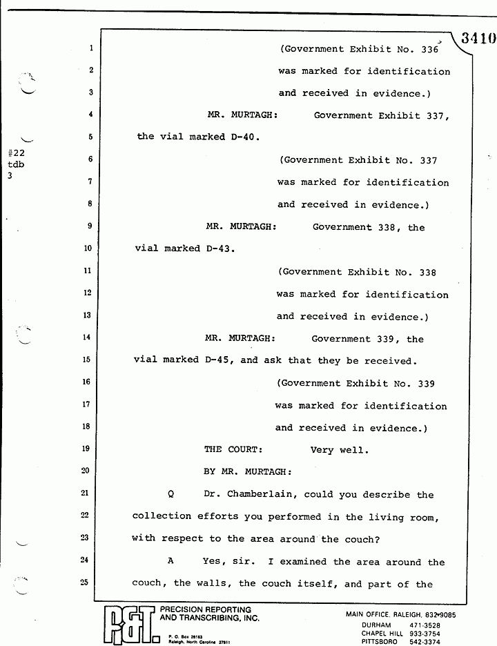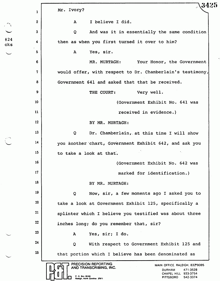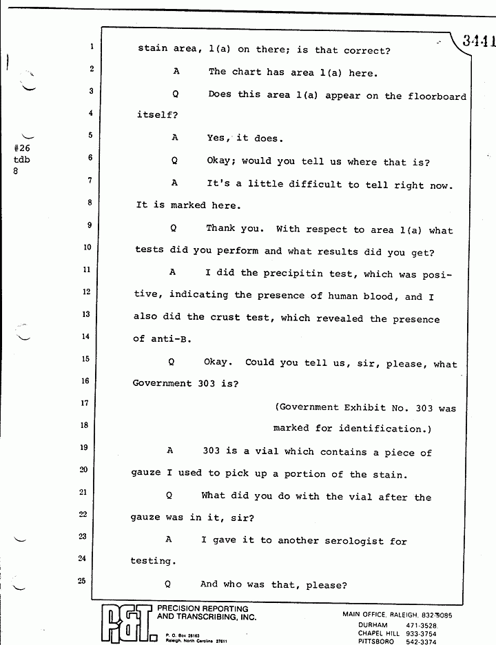 Q All right, let me ask a couple of other questions. Dr. Chamberlain, there are several hundred of these tests that you performed for dried blood stains, were there not, that you participated in performing tests?