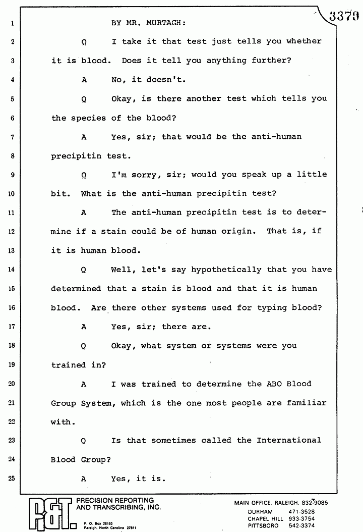 Q Yes. Don't you do a benzidine test first when you are doing dried blood typing? Don't you do a confirmatory test thereafter? Then if those two give you an indication of blood, that is the time you go, in most good laboratories, to the precipitin test?