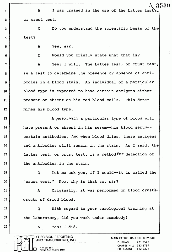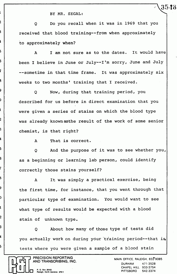 Q Now, during that training period, you described for us before in direct examination that you were given a series of stains on which the blood type was already knownasthe result of the work of some senior chemist, is that right?