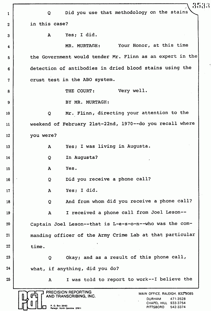 A I received a phone call from Joel Leson -- Captain Joel Leson -- that is L-e-s-o-n -- who was the commanding officer of the Army Crime Lab at that particular time.