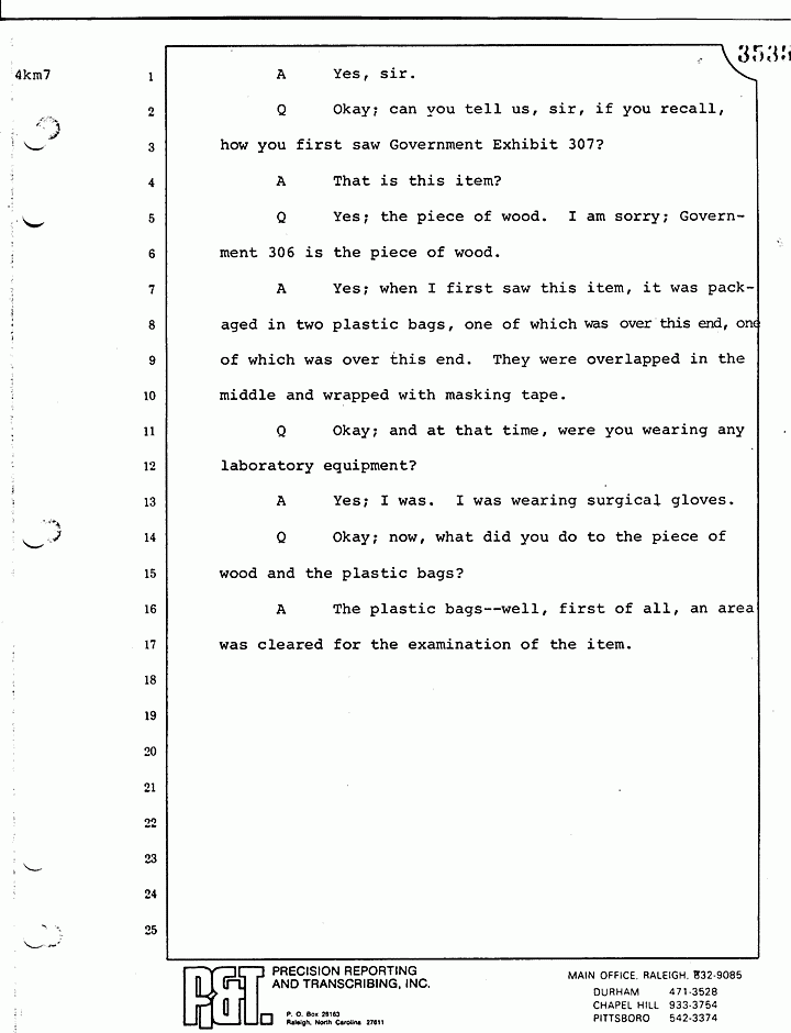 Q Now, Mr. Flinn, with respect to that chart and with respect to Government Exhibit 309, a piece of shag carpet, what tests, if any, did you perform?