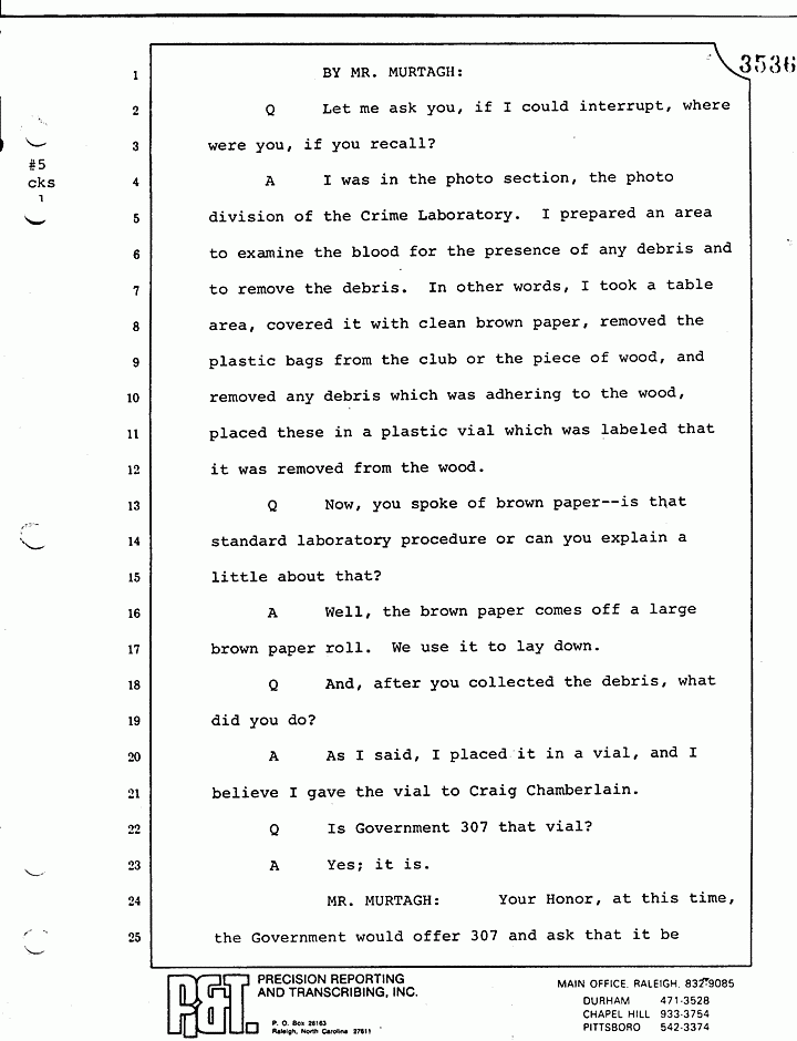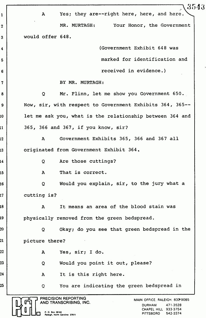 Q Mr. Flinn, let me show you another chart -- 648 -- with two acetate sheets on it. Now, Mr. Flinn, with respect to Government Exhibits 359, 360 and 361 -- which have been identified as suspected blood stains coming from the area by the bed of Kristen MacDonald in the north bedroom -- what tests, if any, did you perform on those stains?
