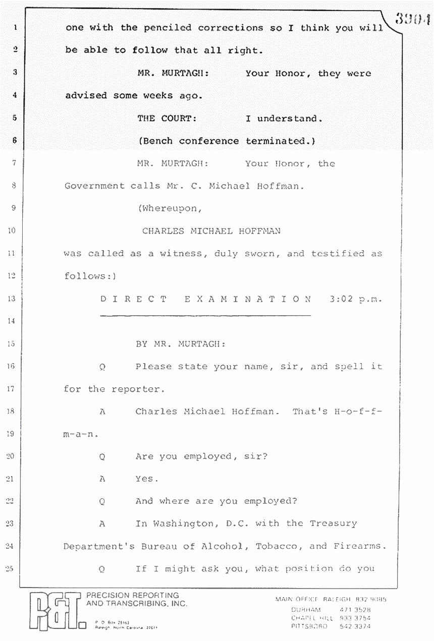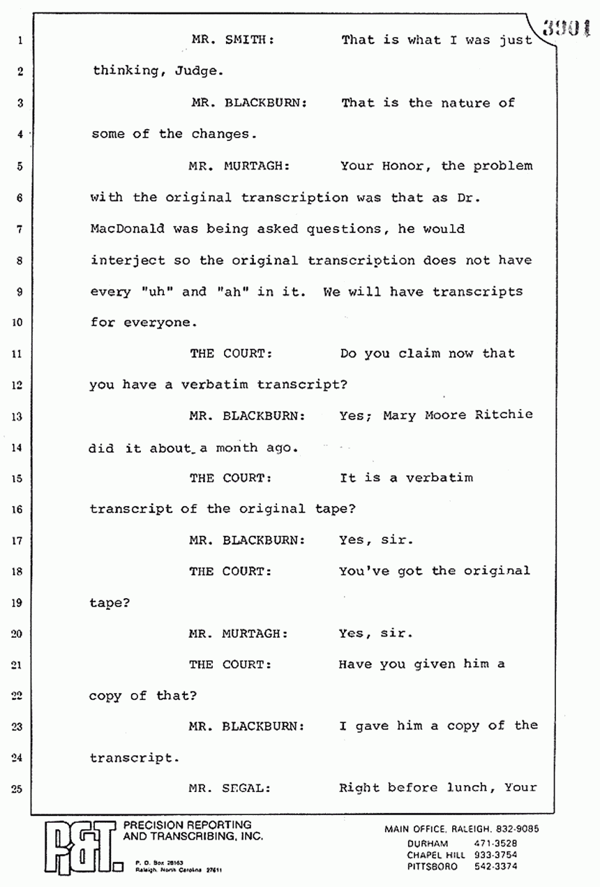 MR. MURTAGH: Your Honor, the problem with the original transcription was that as Dr. MacDonald was being asked questions, he would interject so the original transcript does not have every "uh" and "ah" in it. We will have transcripts for everyone.