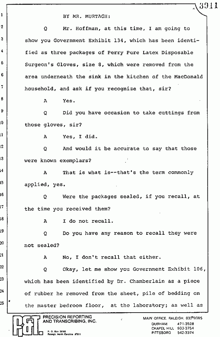 Q Mr. Hoffman, at this time, I am going to show you Government Exhibit 134, which has been identified as three packages of Perry Pure Latex Disposable Surgeon's Gloves, size 8, which were removed from the area underneath the sink in the kitchen of the MacDonald household, and ask if you recognize that, sir?