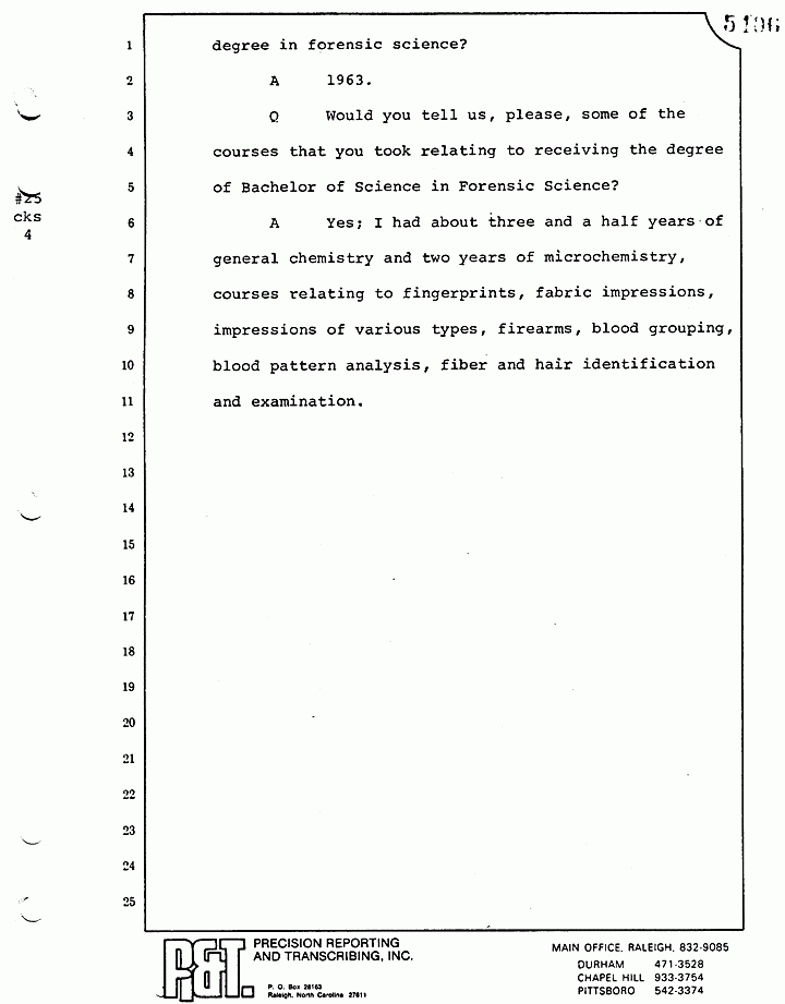 A Yes; I had about three and a half years of general chemistry and two years of microchemistry, courses relating to fingerprints, fabric impressions, impressions of various types, firearms, blood grouping, blood pattern analysis, fiber and hair identification and examination.