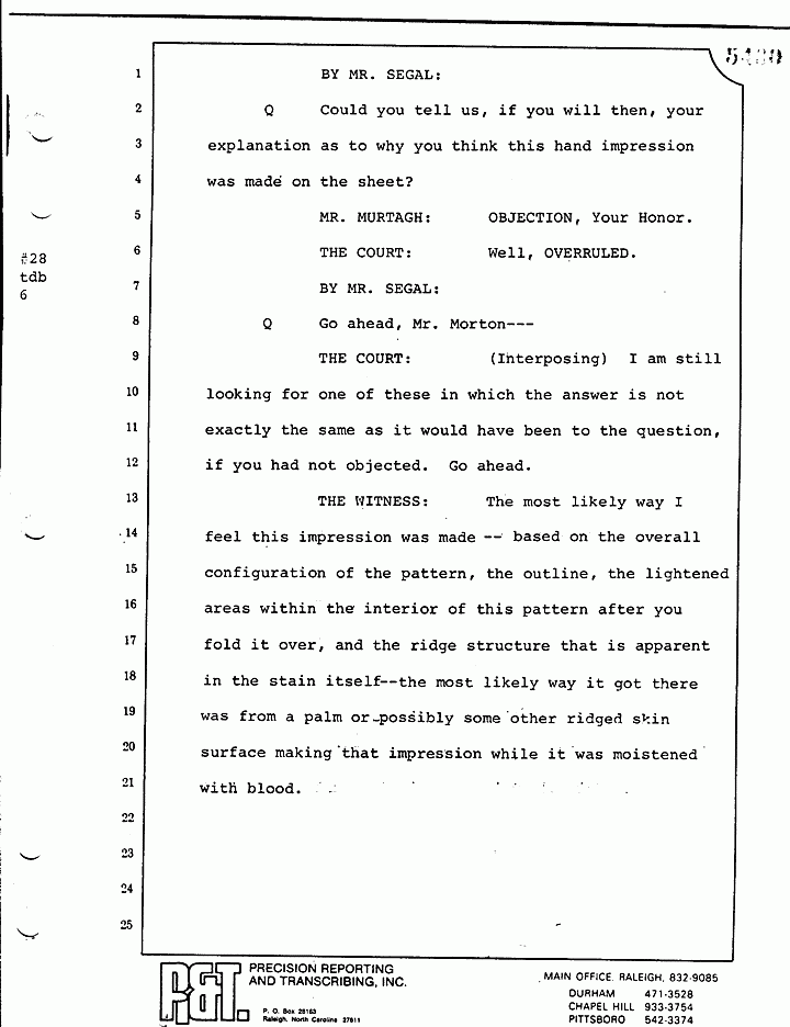 Q Sir, did you hear Dr. Thornton testify that area "F" -- let me hold that out -- in his opinion, I think he agreed with Mr. Strombaugh it could have been made by Colette's left pajama cuff?