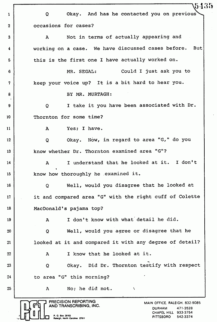 Q Well, would you disagree that he looked at it and compared area "G" with the right cuff of Colette MacDonald's pajama top?