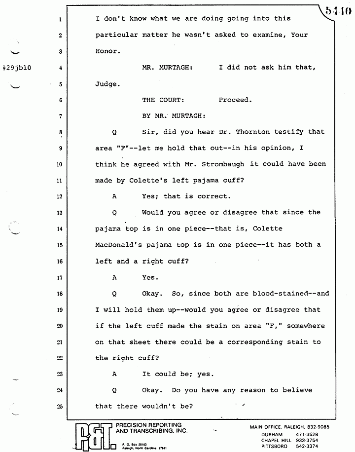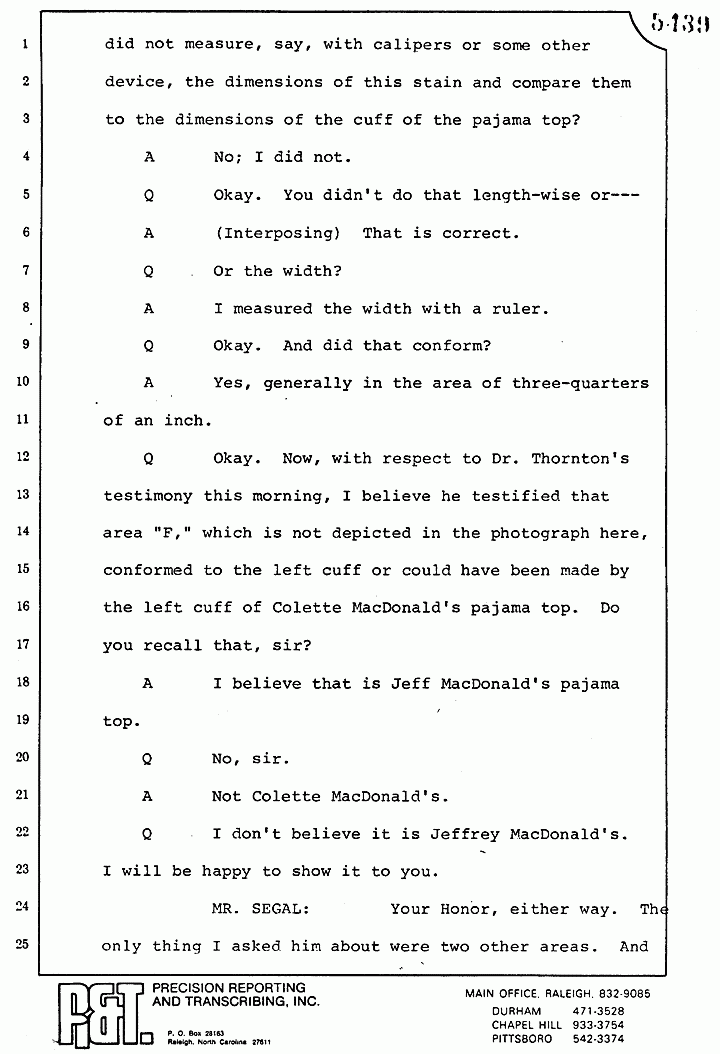 Q Okay. Now, with respect to Dr. Thornton's testimony this morning, I believe he testified that area "F," which is not depicted in the photograph here, conformed to the left cuff or could have been made by the left cuff of Colette MacDonald's pajama top. Do you recall that, sir?