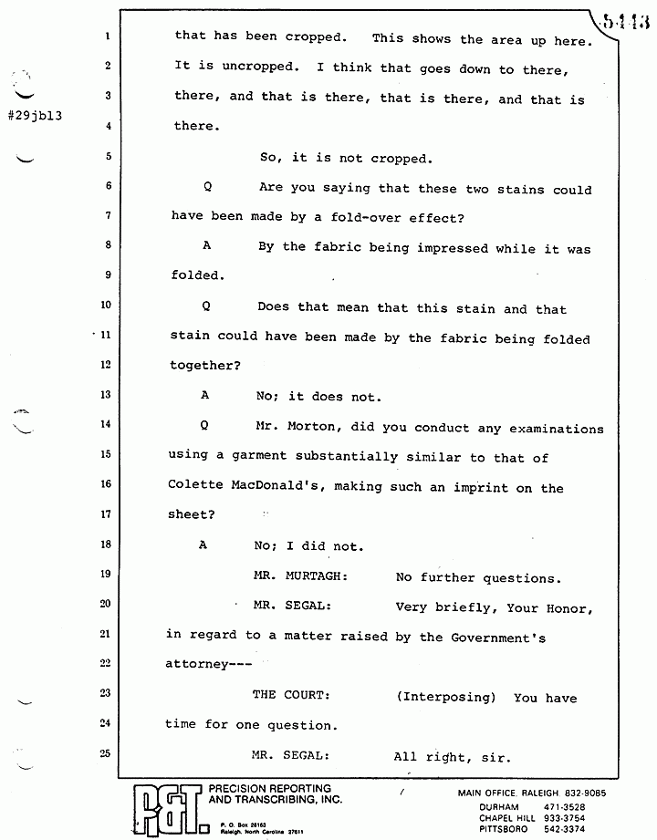 Q Mr. Morton, did you conduct any examinations using a garment substantially similar to that of Colette MacDonald's, making such an imprint on the sheet?