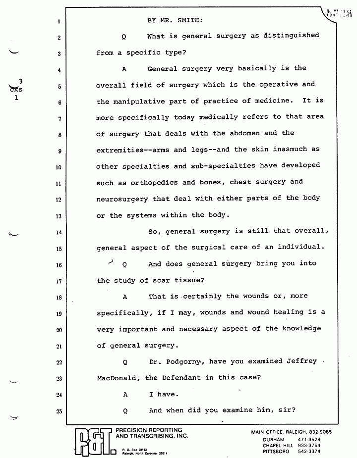 Q Dr. Podgorny, have you examined Jeffrey MacDonald, the Defendant in this case?