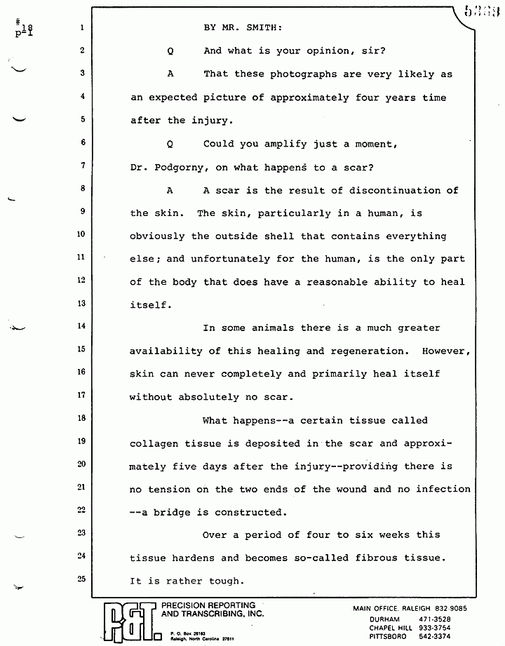 A Yes; scar tissue forms beginning the fifth day after injury under normal circumstances, and I qualify that -- no infection, no foreign bodies, and so on. It then progresses and reaches strength maturity in approximately four to six weeks. Thereafter, it becomes thicker, more prominent, for a period of a few more months, and then starts getting softer and less prominent. In approximately a year, roughly, it is called mature, and that is why any revision of scar or a plastic procedure would not be advisable before at least a year after the event, because the scar is not mature yet. I am sorry if I did not answer --