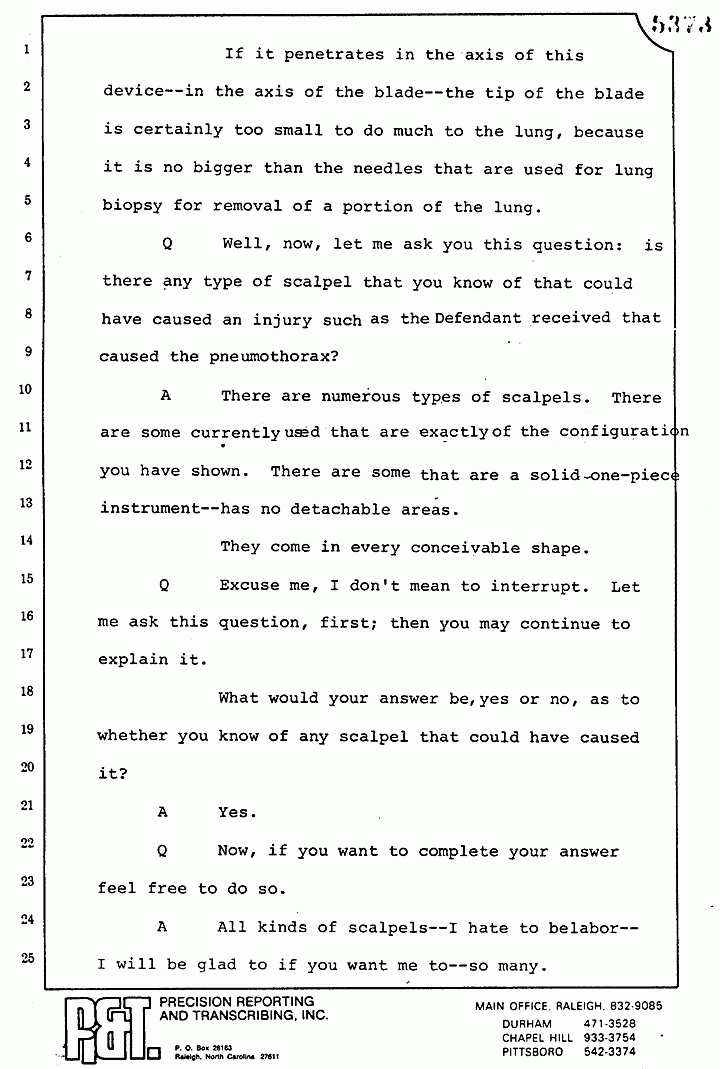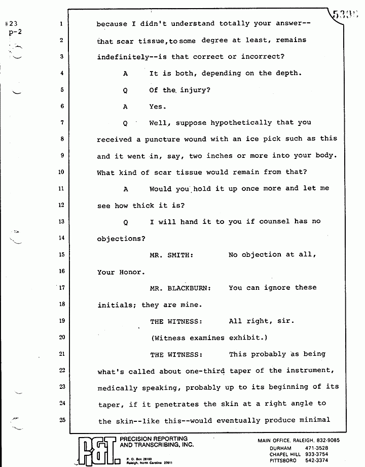 THE WITNESS: This probably as being what's called about one-third taper of the instrument, medically speaking, probably up to its beginning of its taper, if it penetrates the skin at a right angle to the skin -- like this -- would eventually produce minimal scarring, because this will be really what I noticed some of you have been talking about -- puncture wound. That is really a puncture wound. I would say if it penetrates much farther, you would expect to have at least some remnant of a scar because this is fairly substantial in width and will separate a fibers.