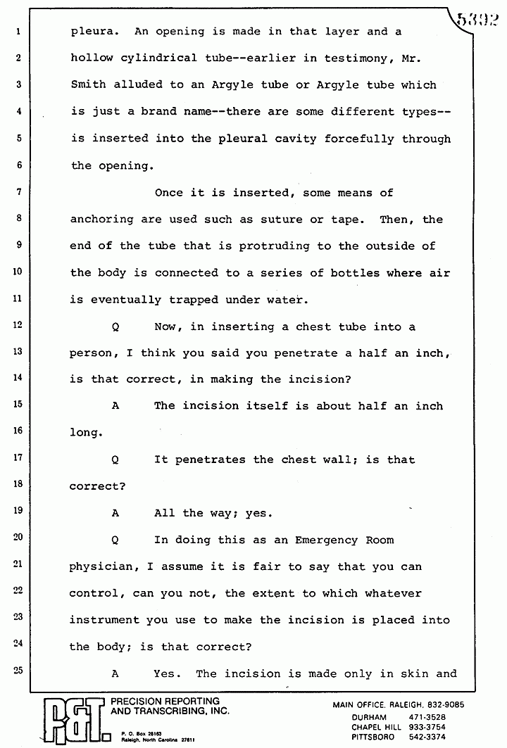 Q Now, in inserting a chest tube into a person, I think you said you penetrate a half an inch, is that correct, in making the incision?