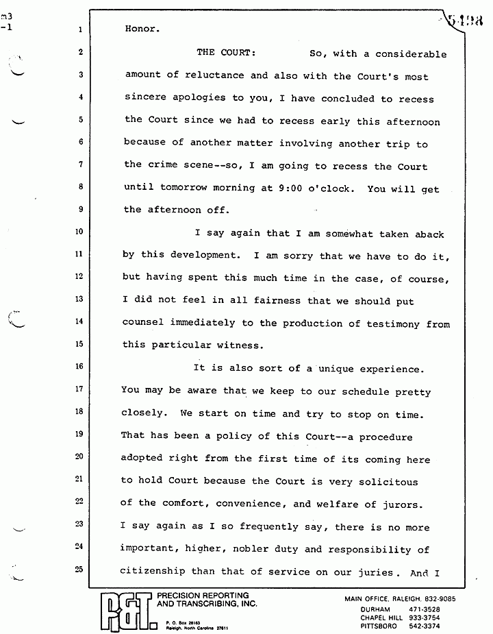 THE COURT: Members of the jury, counsel have conferred with the Court since you were released this morning, and because of the situation which they have stated here just briefly, it appears that this witness who was just the first time in Raleigh this morning around 9:00 o'clock as I understand it and considered by both sides to be a very important witness in the case -- I know nothing about the witness -- but I have acceded to the request of counsel for both sides that they be entitled to continue and complete their interrogation of this particular witness before any other evidence, which I understand was, in fact, dependent upon the foundation to be established by this particular witness. Is that so, Mr. Smith?