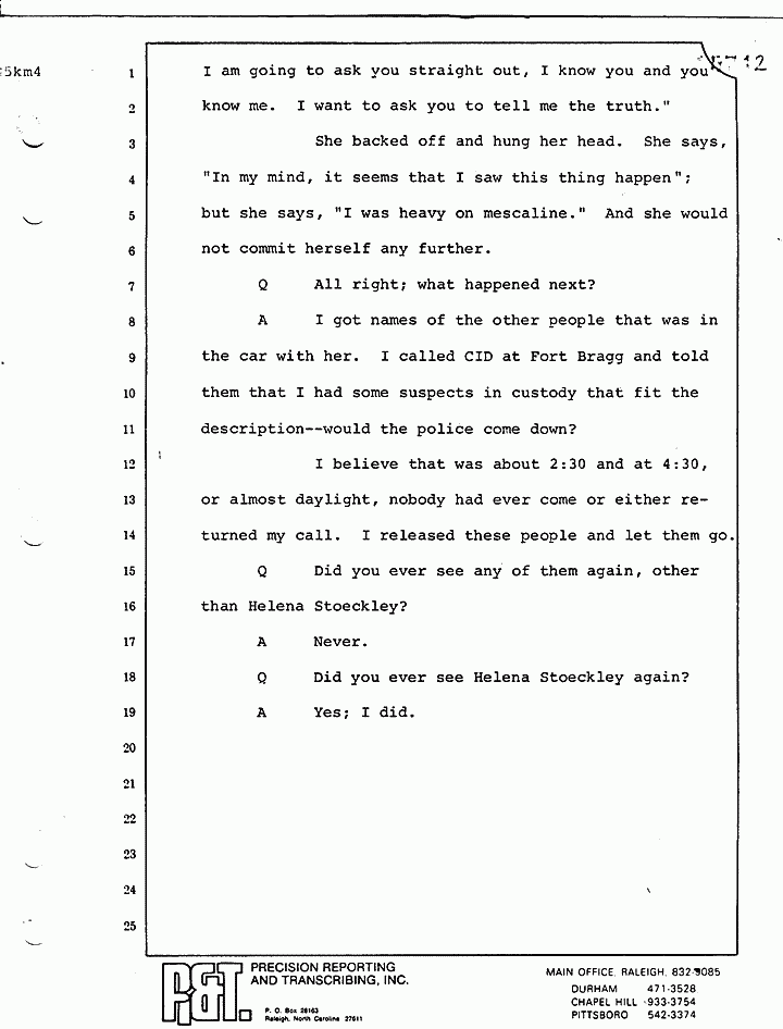 Q Do you recall ever making the statement that during the investigation of the MacDonald murders, she was interviewed by the FBI and the CID and nothing concrete was established regarding her involvement?