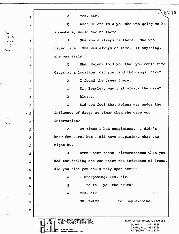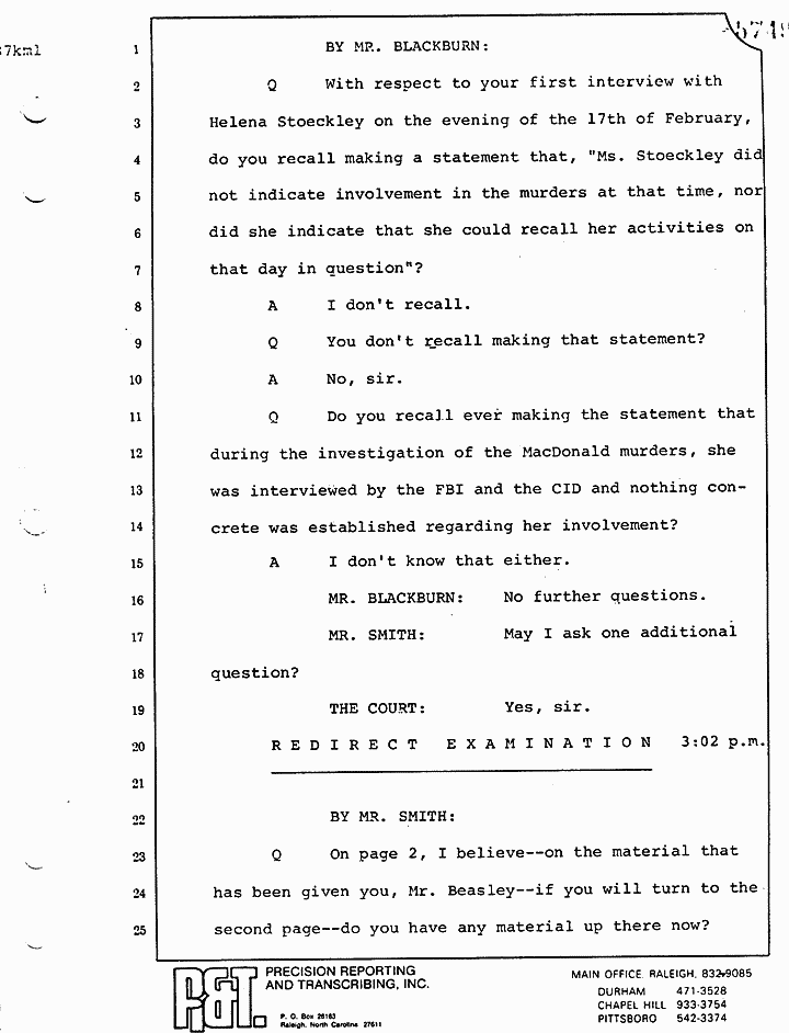 Q Let me interrupt you just for a moment, if I may, Mr. Beasley. I take it you had had many conversations with Ms. Stoeckley prior to that day?