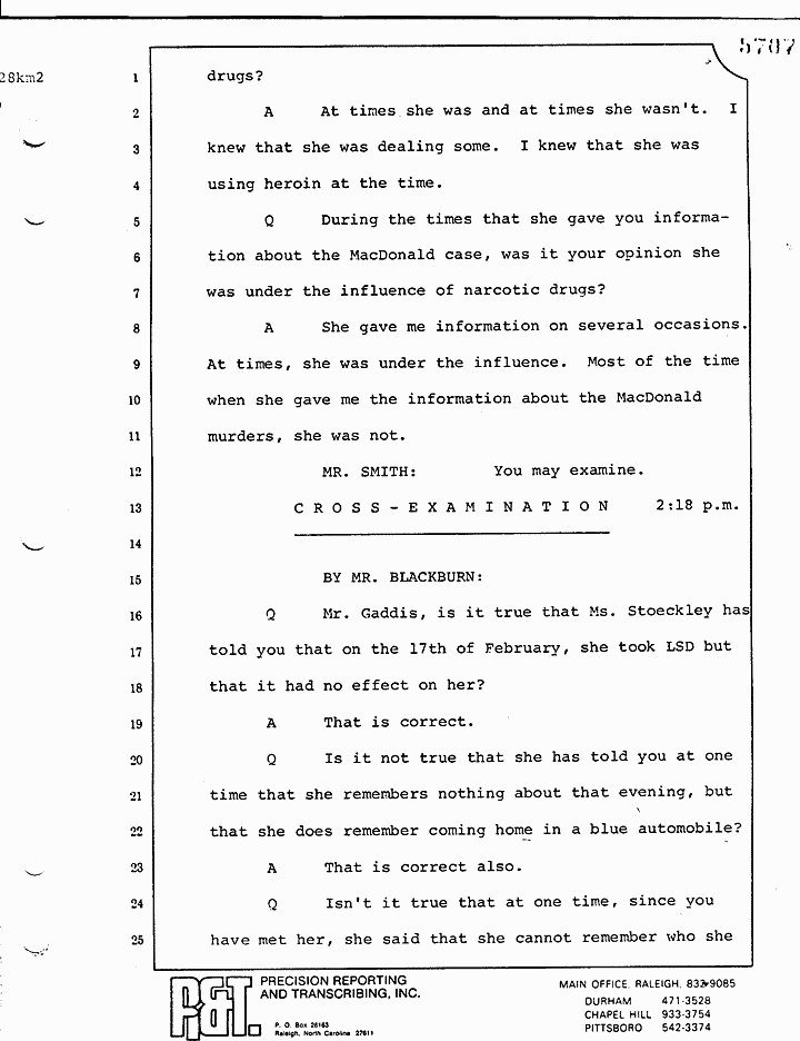 Q Mr. Gaddis, is it true that Ms. Stoeckley has told you that on the 17th of February, she took LSD but that it had no effect on her?