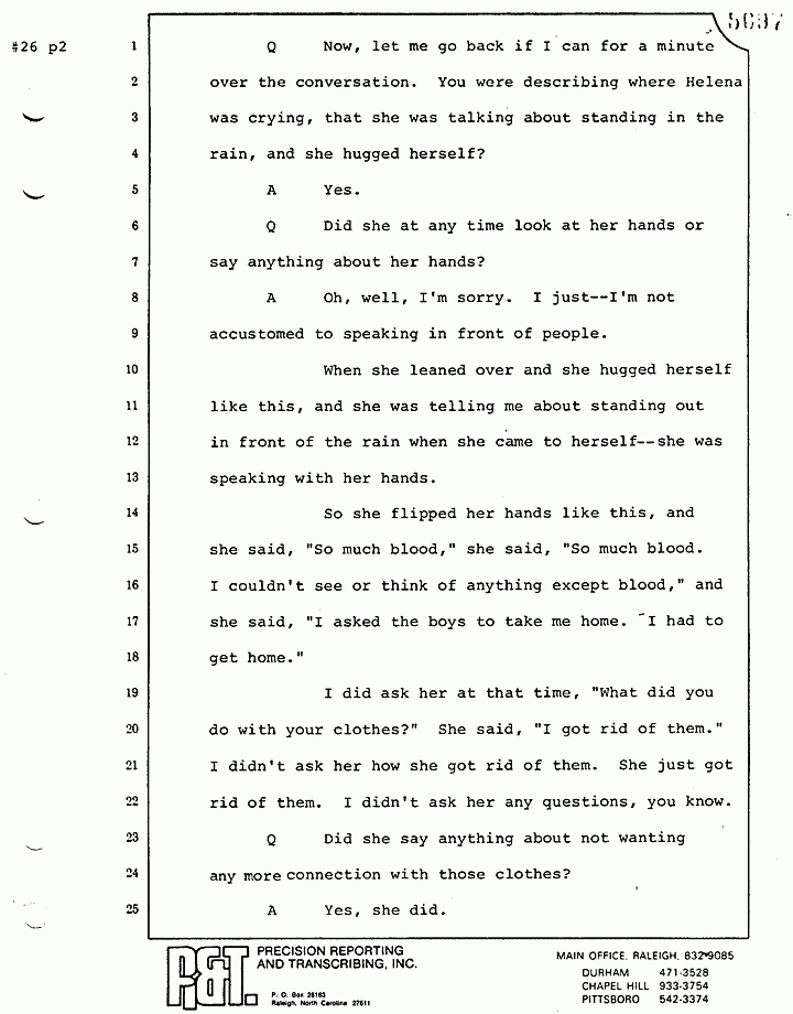Q Now, let me go back if I can for a minute over the conversation. You were describing where Helena was crying, that she was talking about standing in the rain, and she hugged herself?