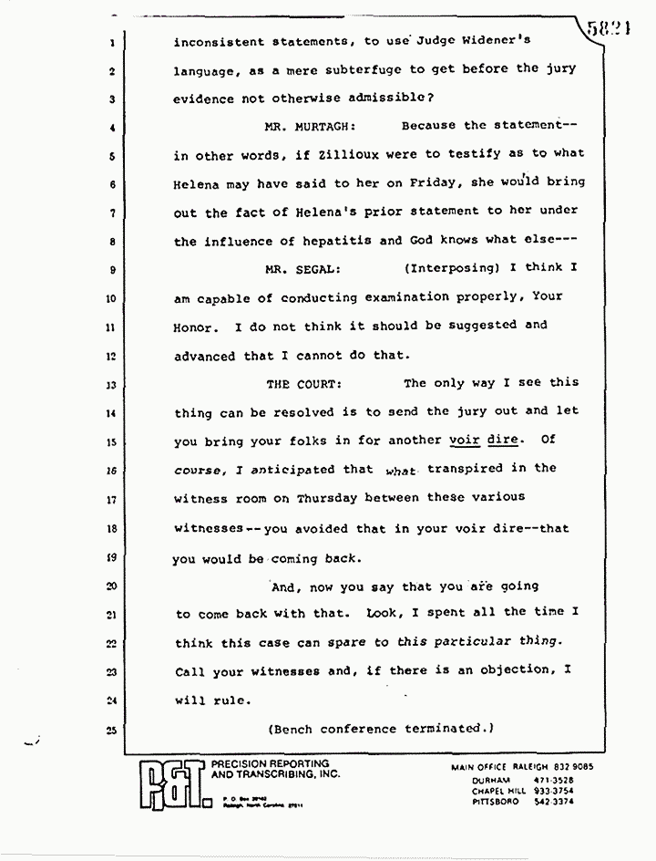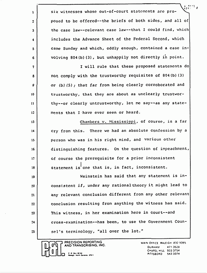 I will rule that these proposed statements do not comply with the trustworthy requisites of 804(b)(3) or (b)(5); that far from being clearly corroborated and trustworthy, that they are about as unclearly trustworthy -- or clearly untrustworthy, let me say -- as any statements that I have ever seen or heard.