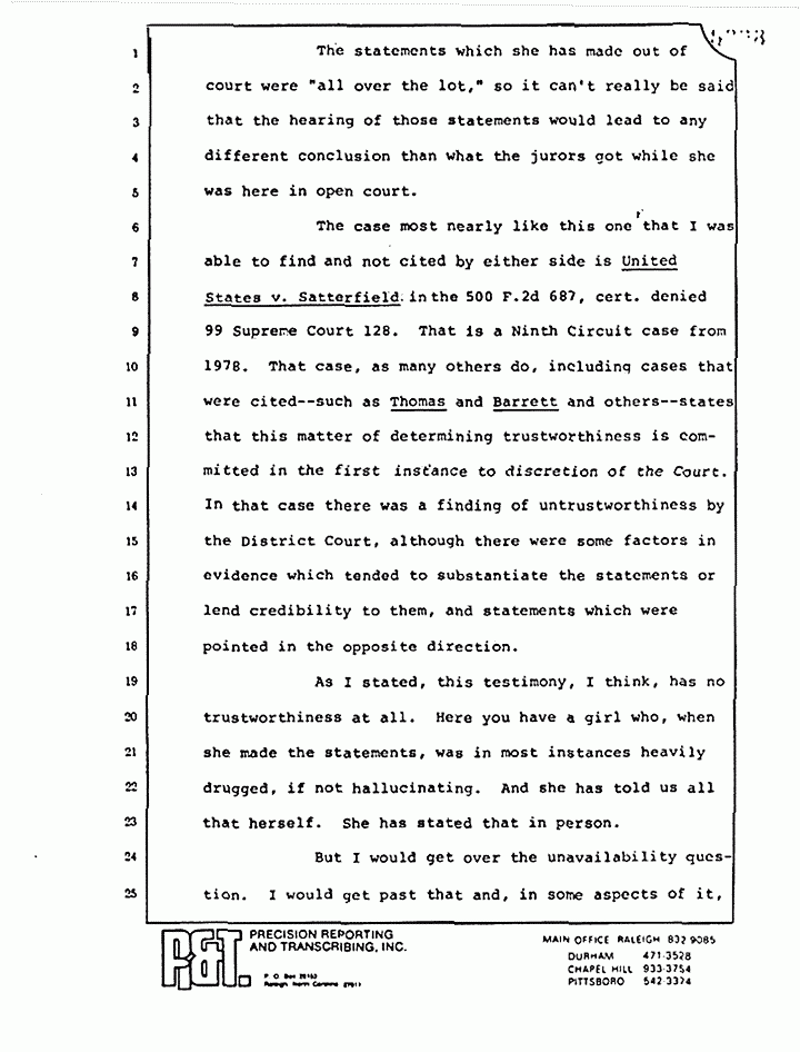 The case most nearly like this one that I was able to find and not cited by either side is United States v. Satterfield: in the 500 F. 2d 687, cert. denied 99 Supreme Court 128. That is a Ninth Circuit case from 1978. That case, as many others do, including cases that were cited -- such as Thomas and Barrett and others -- states that this matter of determining trustworthiness is committed in the first instance to discretion of the Court. In that case there was a finding of untrustworthiness by the District Court, although there were some factors in evidence which tended to substantiate the statements or lend credibility to them, and statements which were pointed in the opposite direction.