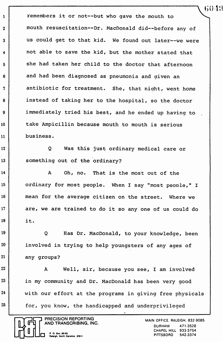 Q Did you ever have occasion to see Dr. MacDonald -- how did he deal with his patients at the hospital and what was the way he treated them as human beings -- not so much as talking about the medical care, although, that is part of it, but really, what was his attitude in the way that he related to people and whether or not he cared about people?
