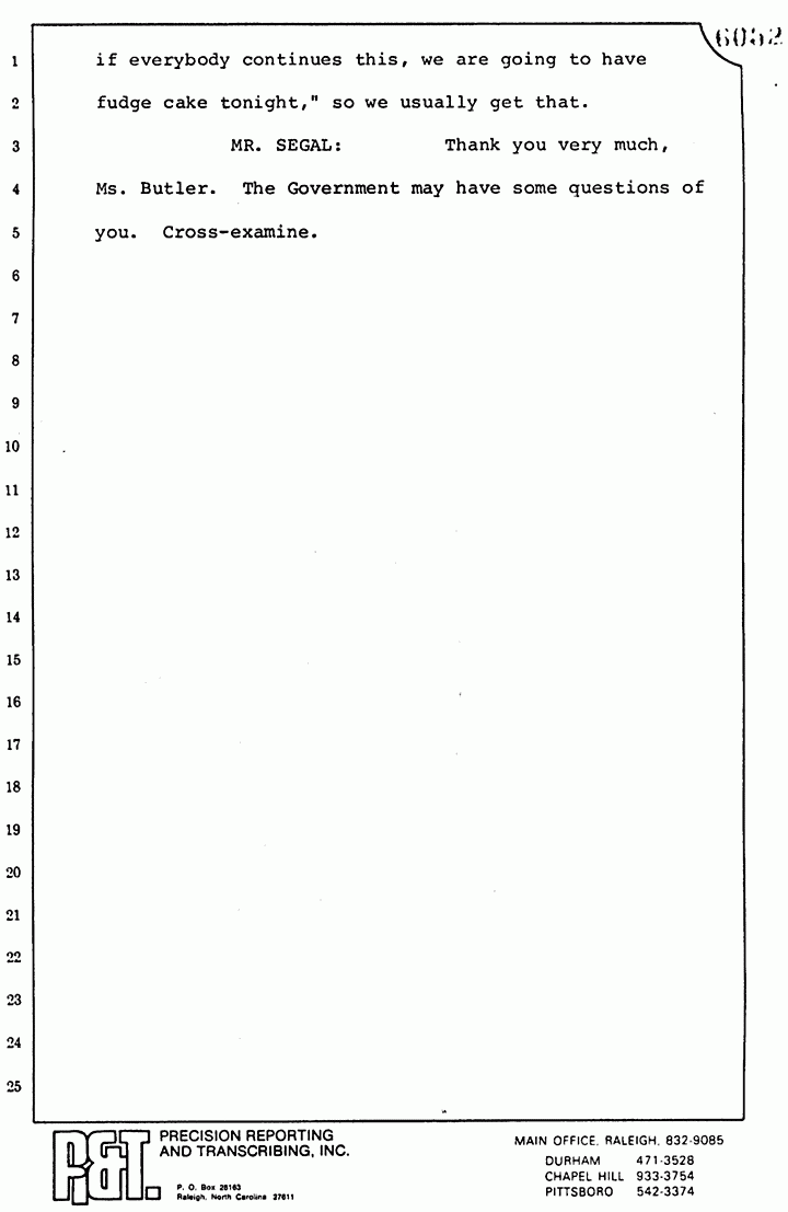 MR. SEGAL: Thank you very much, Ms. Butler. The Government may have some questions of you. cross-examine.