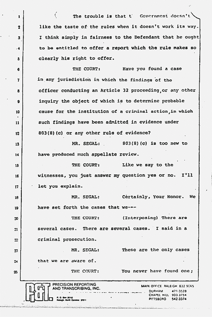 THE COURT: Have you found a case in any jurisdiction in which the findings of the officer conducting an Article 32 proceeding, or any other inquiry the object of which is to determine probable cause for the institution of a criminal action, in which such findings have been admitted in evidence under 803(8)(c) or any other rule of evidence?