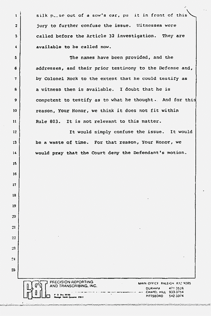 The names have been provided, and the addresses, and their prior testimony to the Defense and, by Colonel Rock to the extent that he could testify an a witness then is available. I doubt that he is competent to testify as to what he thought. And for this reason, Your Honor, we think it does not fit within Rule 803. It is not relevant to this matter. It would simply confuse the issue. It would be a waste of time. For that reason, Your Honor, we would pray that the Court deny the Defendant's notion.