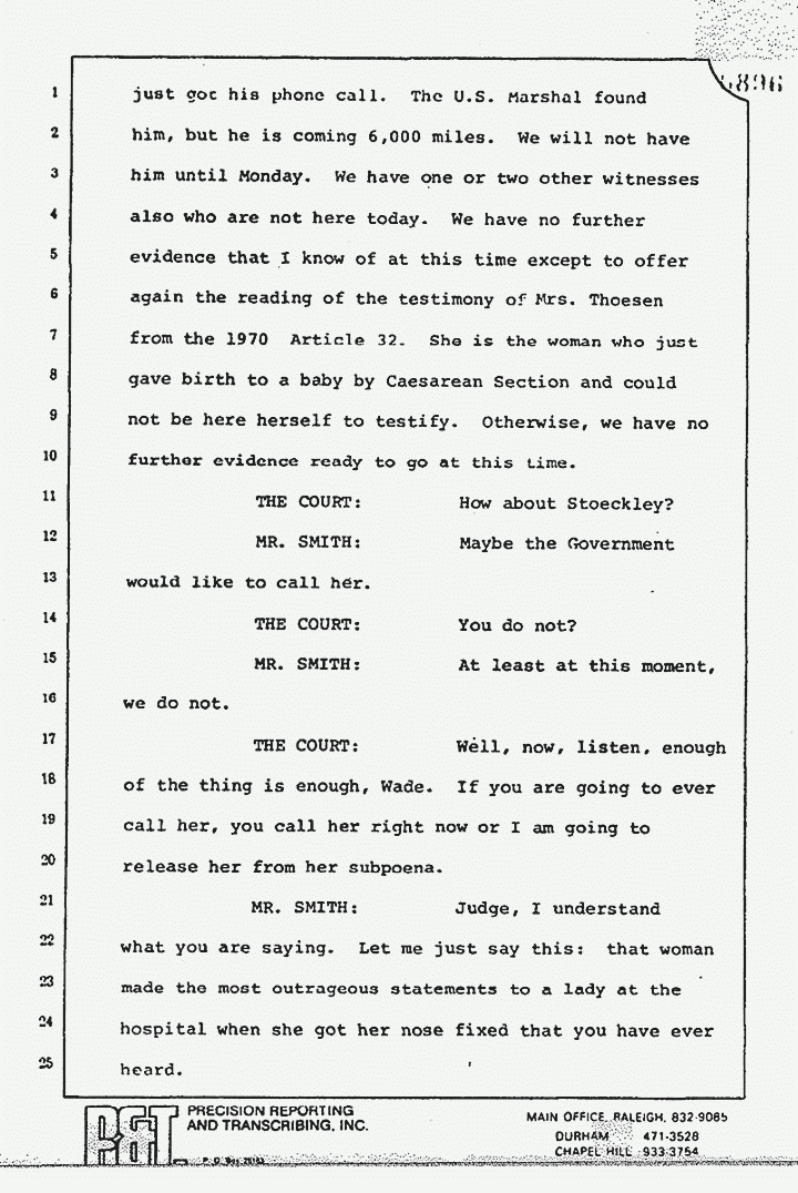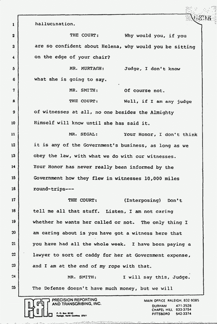 MR. MURTAGH: That doesn't change the Court's previous finding as to her mental state. I think we should not go to the wire or to the jury for that matter with Helena Stoeckley still lurking in the wings. I think they have had ample opportunity to put her on. I think this is about the third time that it has come up, "Are you going to put her on or not," and, I think, Judge, that we are entitled -- everybody is entitled -- the Court, the jury, and all concerned -- that we don't have to sit on the edge of the chair and wonder whether Ms. Stoeckley is going to have another hallucination.
