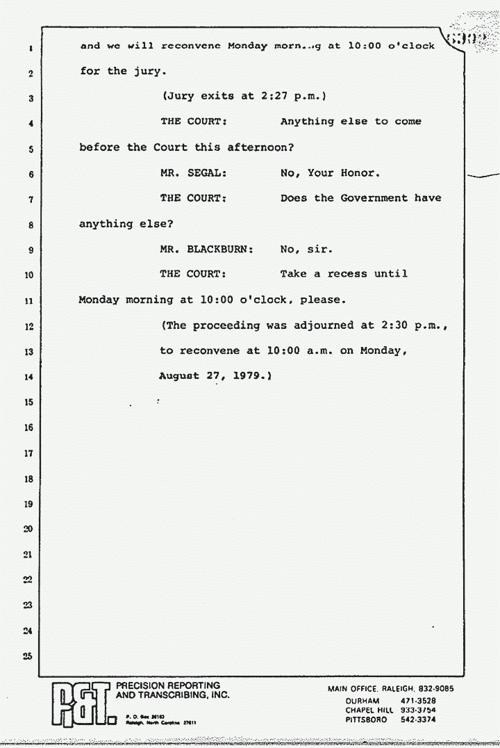 (The proceeding was adjourned at 2:30 p.m., to reconvene at 10:00 a.m. on Monday, August 27, 1979.)