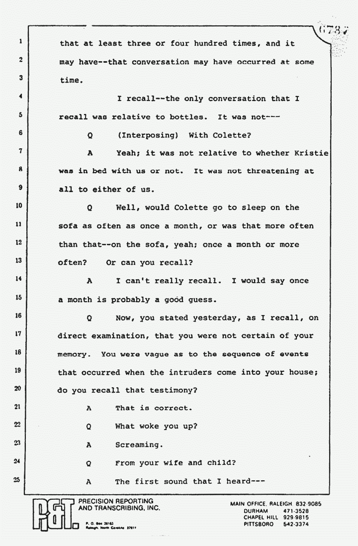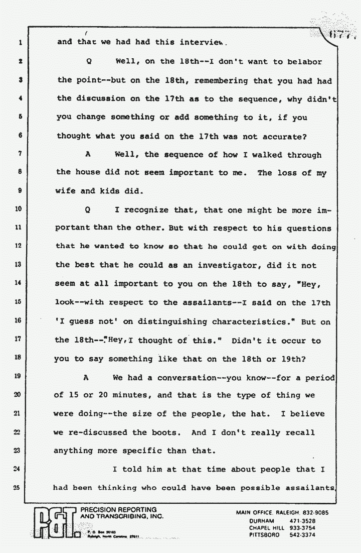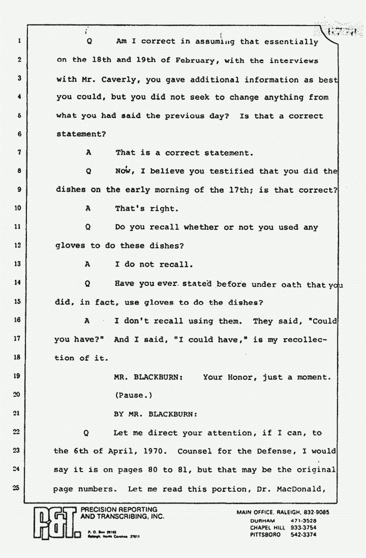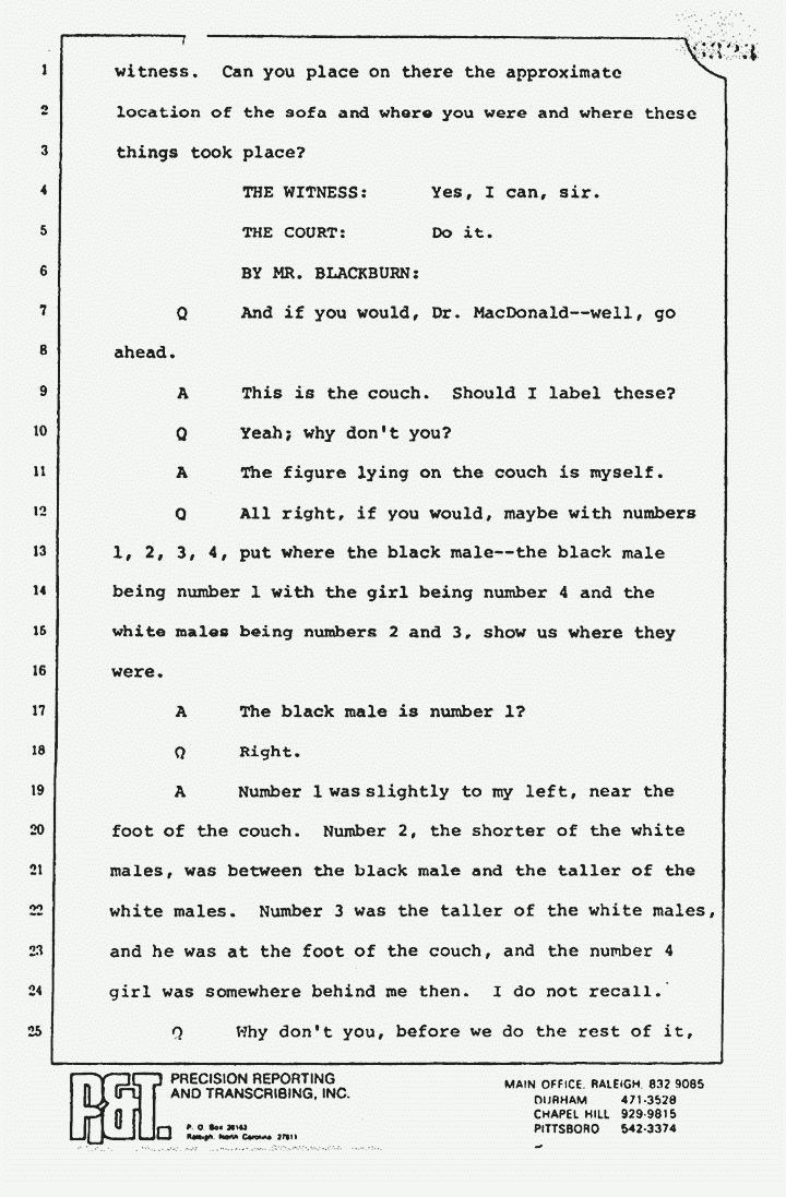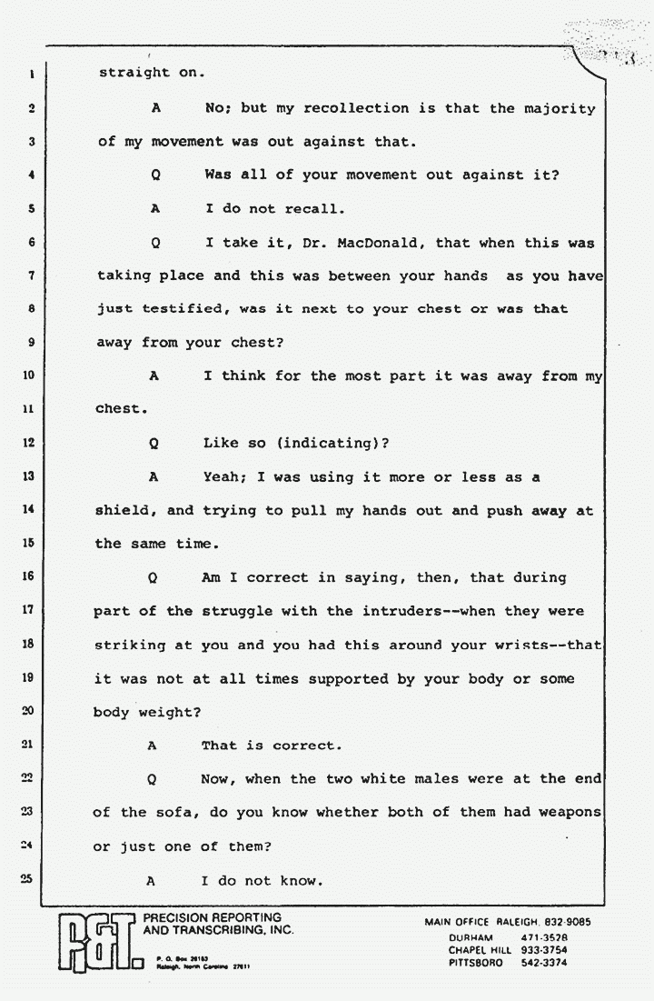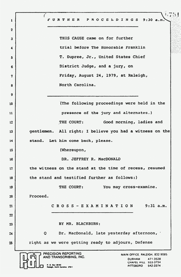 (Whereupon, DR. JEFFREY R. MacDONALD, the witness on the stand at the time of recess, resumed the stand and testified further as follows:)
