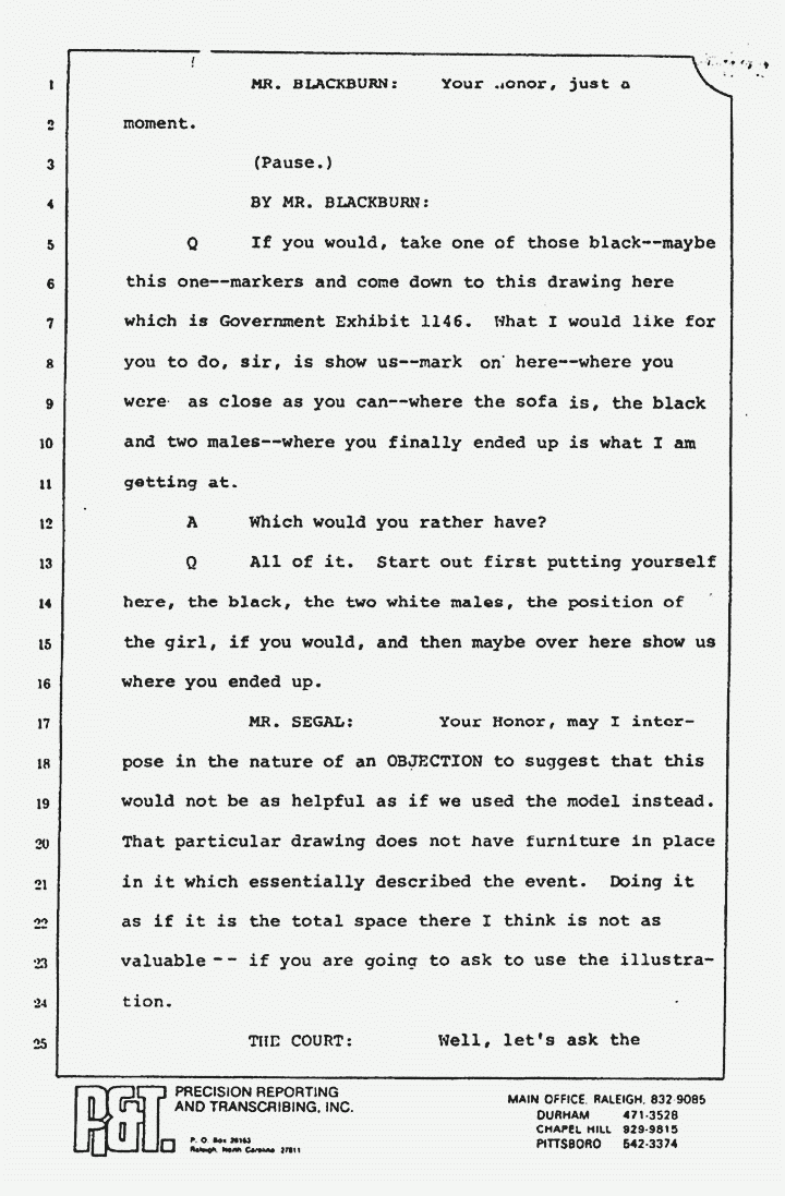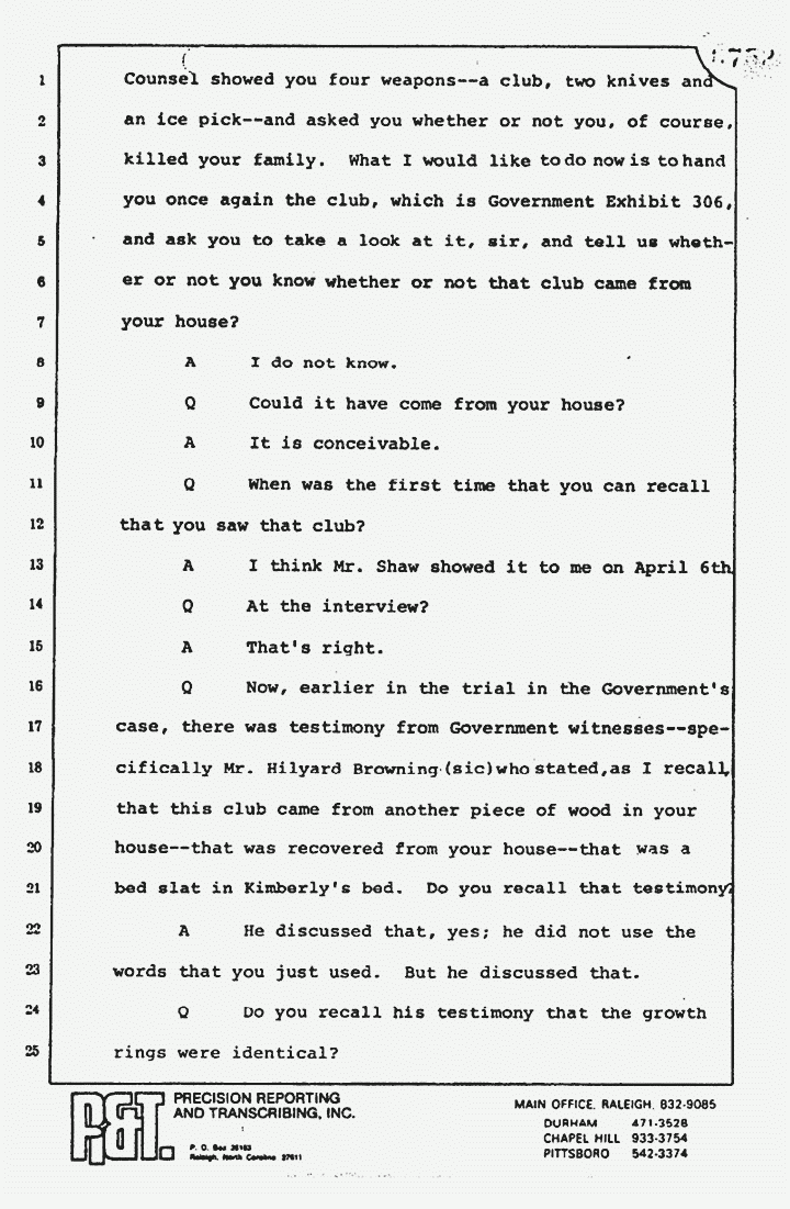 Q Now, earlier in the trial in the Government's case, there was testimony from Government witnesses -- specifically Mr. Hilyard Browning (sic) who stated, as I recall, that this club came from another piece of wood in your house -- that was recovered from your house -- that was a bed slat in Kimberly's bed. Do you recall that testimony?