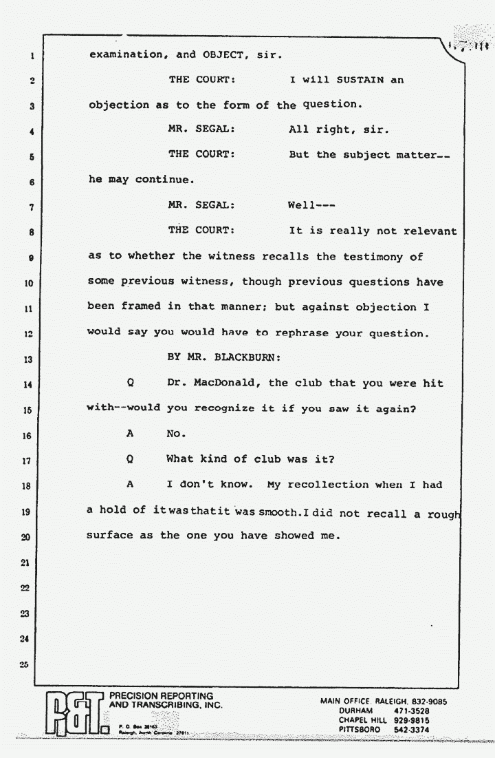 Q Dr. MacDonald, late yesterday afternoon, right as we were getting ready to adjourn, Defense Counsel showed you four weapons -- a club, two knives and an ice pick -- and asked you whether or not you, of course, killed your family. What I would like to do now is to hand you once again the club, which is Government Exhibit 306, and ask you to take a look at it, sir, and tell us whether or not you know whether or not that club came from your house?