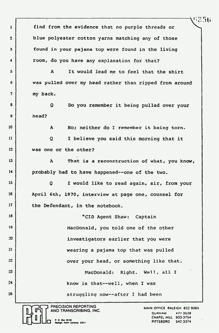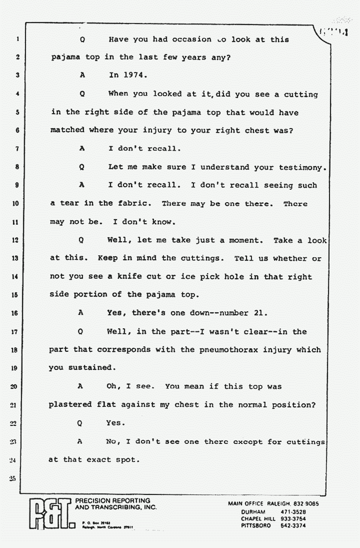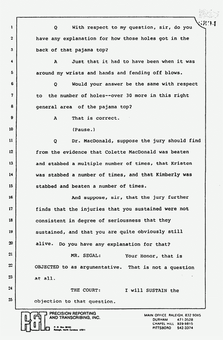 Q Dr. MacDonald, let me show you Government Exhibit 608(a), purporting to be the blue pajama top. Suppose that the jury should find from the evidence that one, there are approximately 17 puncture holes in the back of that pajama top, and secondly, that you had no injuries, puncture or otherwise, in your back.