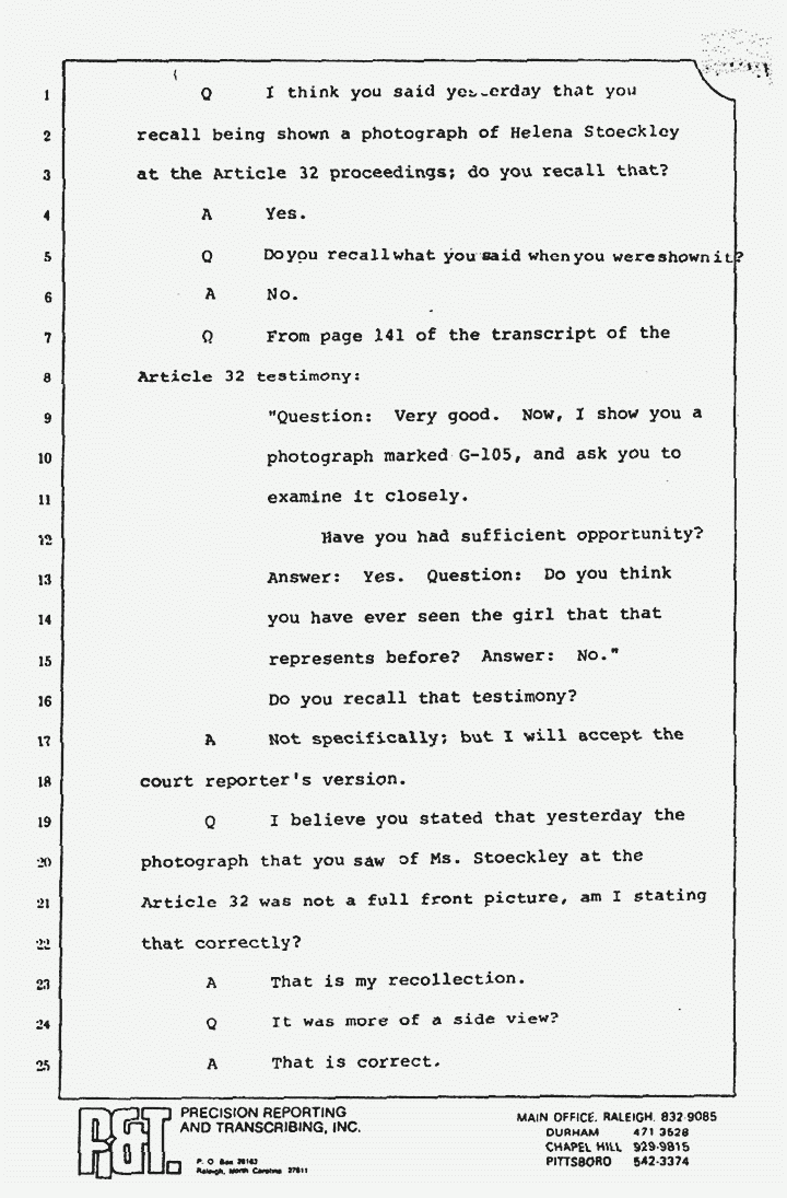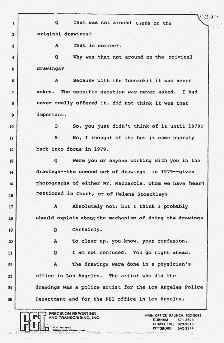 Q Were you or anyone working with you in the drawings -- the second set of drawings in 1979 -- given photographs of either Mr. Mazzarole, whom we have heard mentioned in court, or of Helena Stoeckley?