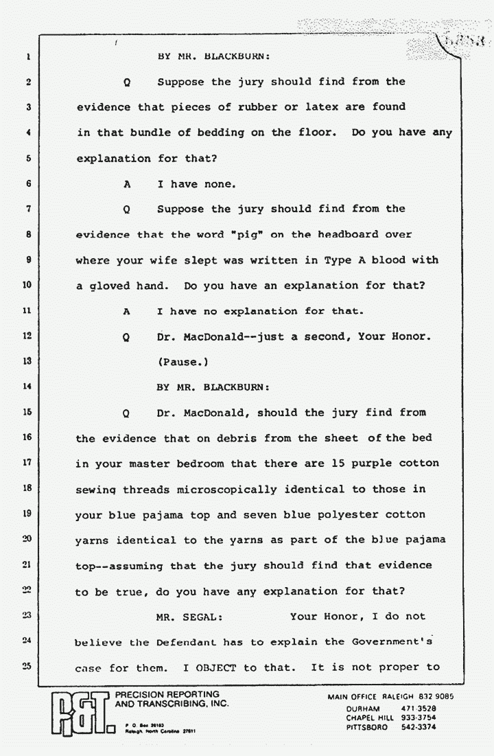 Q Dr. MacDonald, suppose the jury should find from the evidence that Type B blood, the same type as yours, is found in only one place on the blue pajama top belonging to you. Do you have any explanation for that, sir?