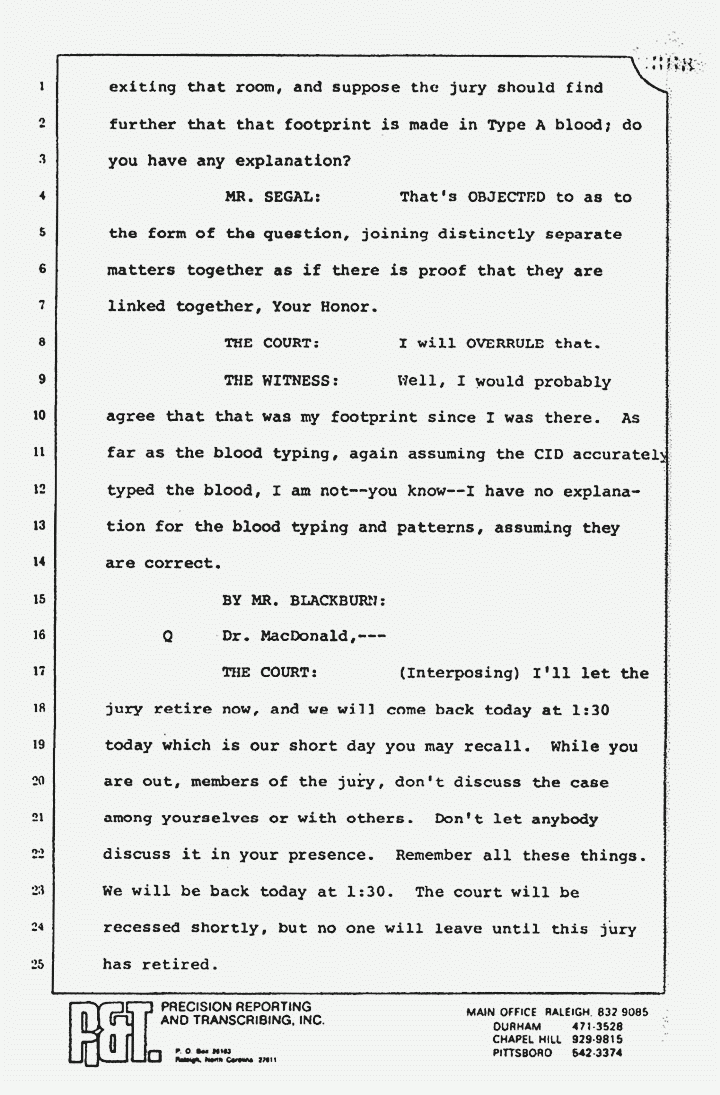 Q Dr. MacDonald, suppose the jury should find from the evidence that there is no blood or was no blood that was sufficient to be typed -- sufficient quantities to be typed -- on either the telephone in the master bedroom or the kitchen and that they should find from the evidence that you went there and used the phone as you have indicated; do you have any explanation for why there would be no blood?