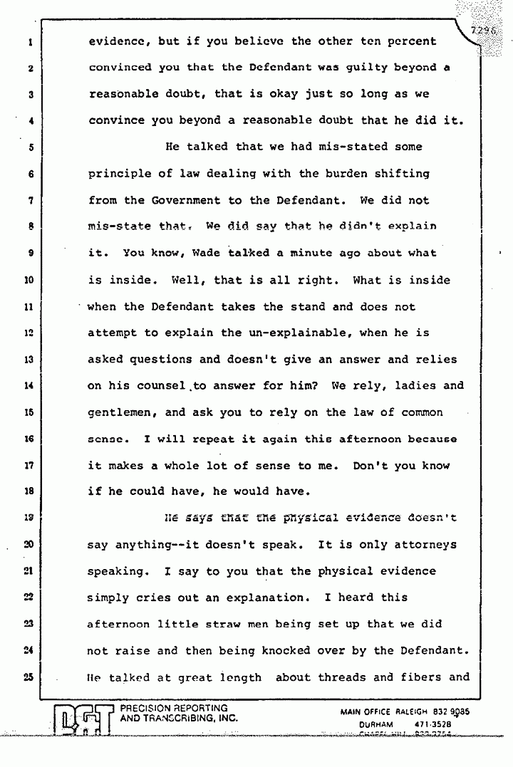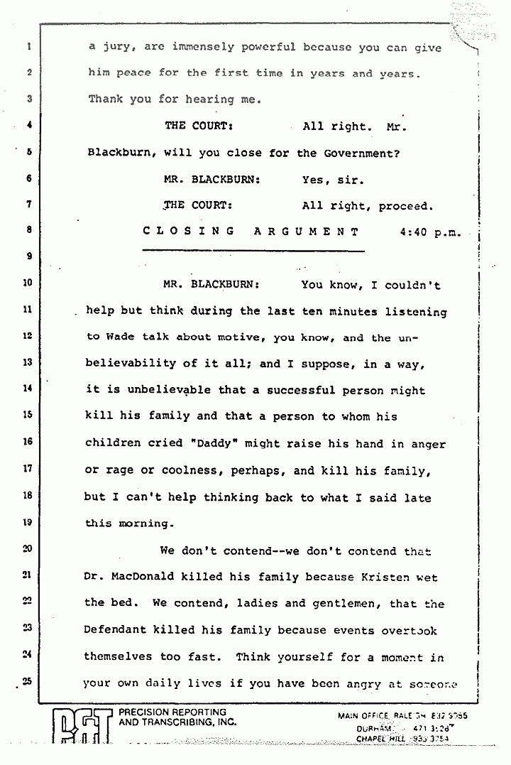 They read you part of Stombaugh's testimony and tried to imply that he changed his story. Huh-uh. You remember what he said? He said, "We re-folded it exactly the same way," and they did. They put the left sleeve on the floor, they took the right sleeve and put it inside out, and they put it as best they could on a mannequin or something. Stombaugh never said, "We placed it in the same position." There is a big difference in the words "placed" and in the words "re-fold." The fact that 48 thrusts or 21 thrusts through the pajama top can make 48 holes is a singular significant fact which I tell you proves to me beyond a reasonable doubt that Jeffrey MacDonald killed his wife, Colette, and it is a very short leap from that to say that he killed the other two as well.