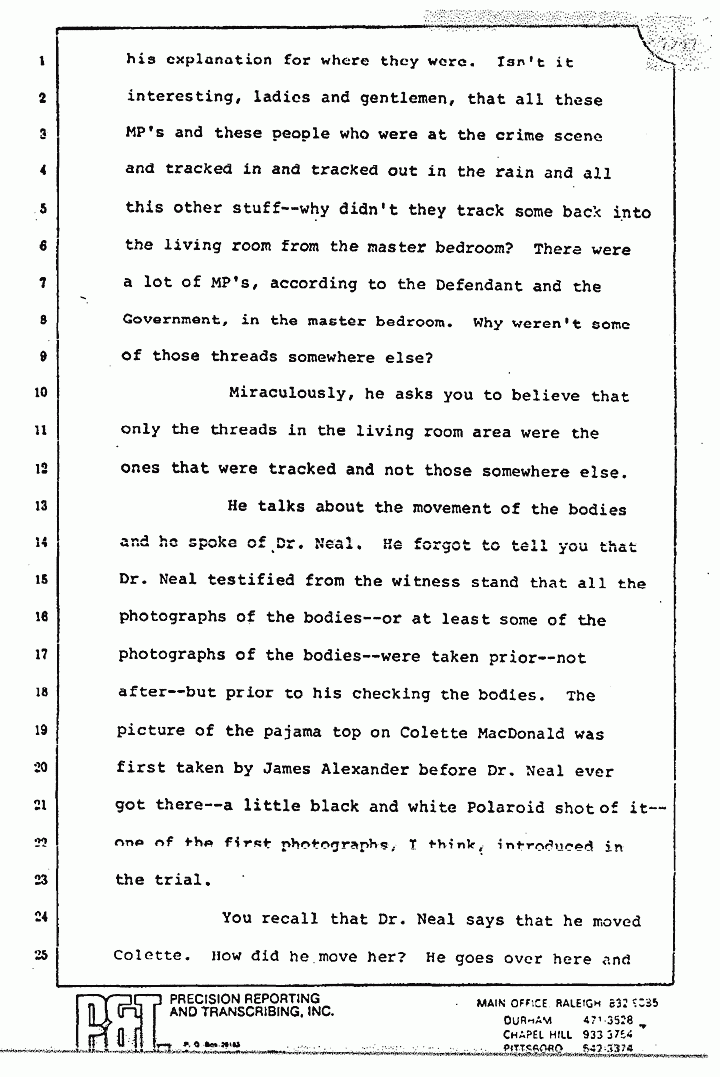 He talks about the movement of the bodies and he spoke of Dr. Neal. He forgot to tell you that Dr. Neal testified from the witness stand that all the photographs of the bodies -- or at least some of the photographs of the bodies -- were taken prior -- not after -- but prior to his checking the bodies. The picture of the pajama top on Colette MacDonald was first taken by James Alexander before Dr. Neal ever got there -- a little black and white Polaroid shot of it -- one of the first photographs, I think, introduced in the trial.
