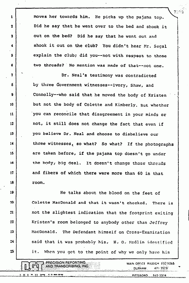 Dr. Neal's testimony was contradicted by three Government witnesses -- Ivory, Shaw and Connolly -- who said that he moved the body of Kristen but not the body of Colette and Kimberly. But whether you can reconcile that disagreement in your minds or not, it still does not change the fact that even if you believe Dr. Neal and choose to disbelieve our three witnesses, so what? So what? If the photographs are taken before, if the pajama top doesn't go under the body, big deal. It doesn't change those threads and fibers, of which there were more than 60 in that room.