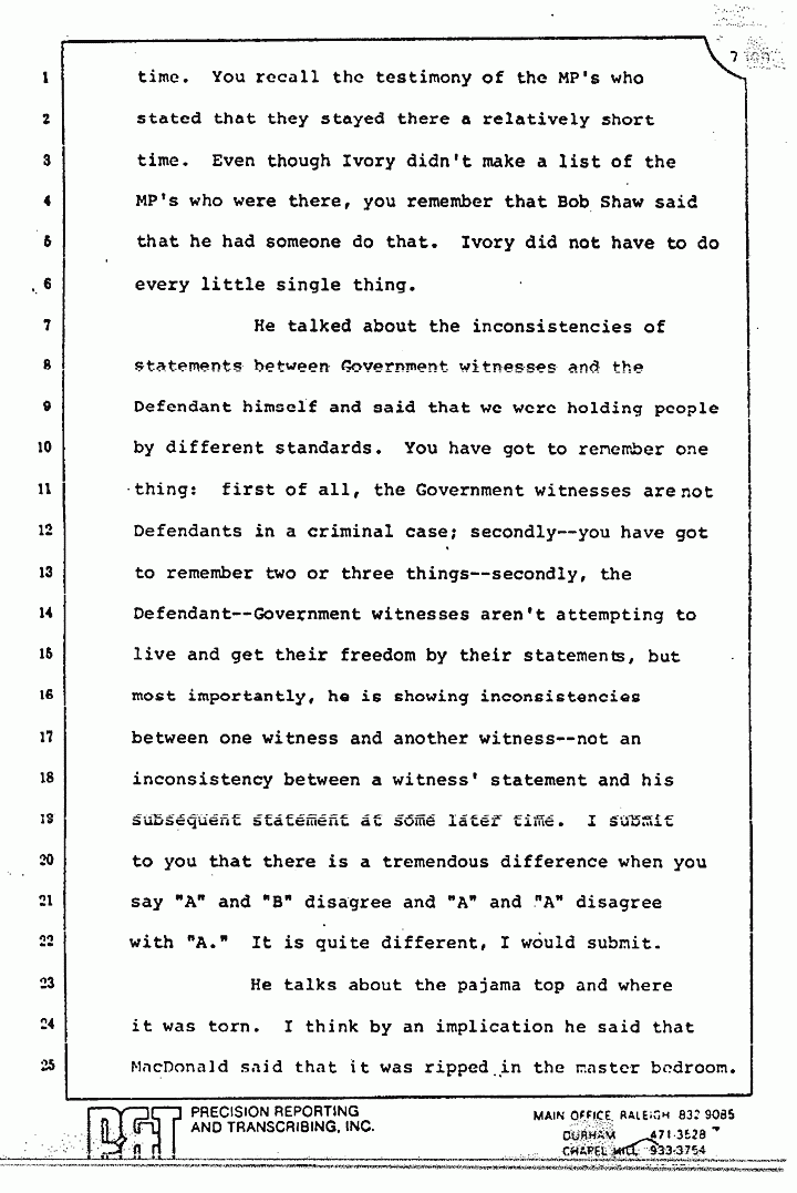 He talks about the pajama top and where it was torn. I think by an implication he said that MacDonald said that it was ripped in the master bedroom. Huh-uh. MacDonald said that he took it off in the master bedroom and he did not hear a ripping sound. MacDonald said that he doesn't know where it was torn and he cannot come by his counsel and tell you, "Now, we do know where it was torn." In any event, we don't disagree necessarily on that. We believe it was torn in the master bedroom.