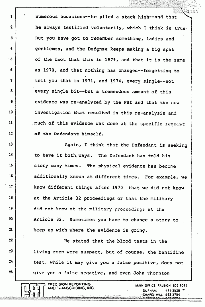 Ladies and gentlemen, the Defendant has testified and I would agree with the Defense that on and the shoulder area in which he numerous occasions -- he piled a stack high -- and that he always testified voluntarily, which I think is true. But you have got to remember something, ladies and gentlemen, and the Defense keeps making a big spat of the fact that this is 1979, and that it is the same as 1970, and that nothing has changed -- forgetting to tell you that in 1971, and 1974, every single -- not every single bit -- but a tremendous amount of this evidence was re-analyzed by the FBI and that the new investigation that resulted in this re-analysis and much of this evidence was done at the specific request of the Defendant himself.
