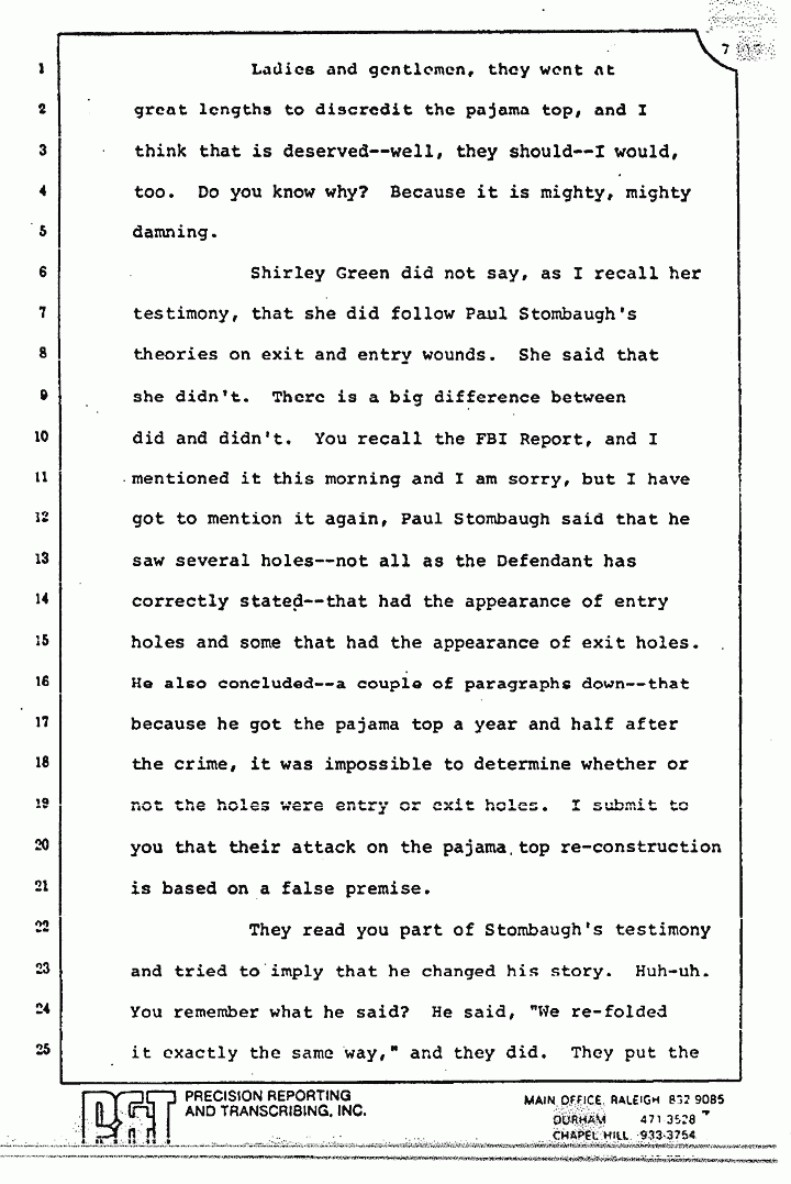 Shirley Green did not say, as I recall her testimony, that she did follow Paul Stombaugh's theories on exit and entry wounds. She said that she didn't. There is a big difference between did and didn't. You recall the FBI Report, and I mentioned it this morning and I am sorry, but I have got to mention it again, Paul Stombaugh said that he saw several holes -- not all as the Defendant has correctly stated -- that had the appearance of entry holes and some that had the appearance of exit holes. He also concluded -- a couple of paragraphs down -- that because he got the pajama top a year and a half after the crime, it was impossible to determine whether or not the holes were entry or exit holes. I submit to you that their attack on the pajama top reconstruction is based on a false premise.