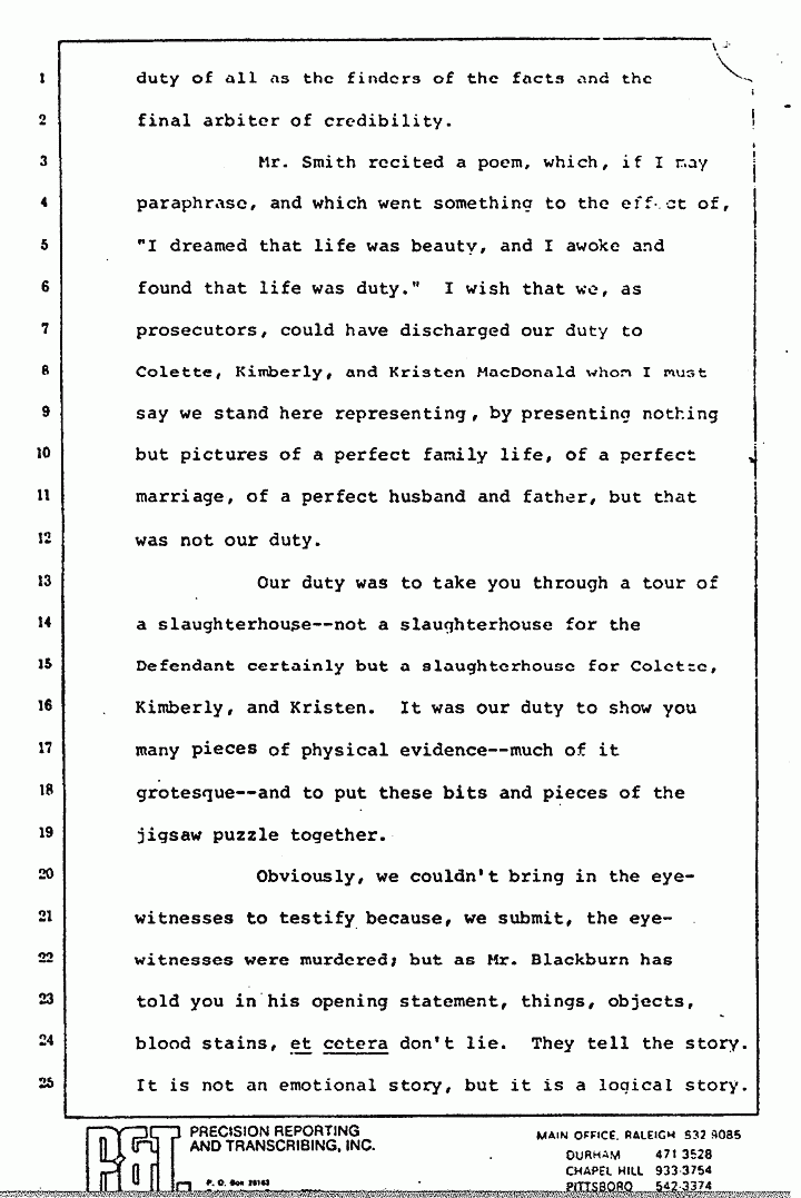 Mr. Smith recited a poem, which, if I may paraphrase, and which went something to the effect of, "I dreamed that life was beauty, and I awoke and found that life was duty." I wish that we, as prosecutors, could have discharged our duty to Colette, Kimberly, and Kristen MacDonald, whom I must say we stand here representing, by presenting nothing but pictures of a perfect family life, of a perfect marriage, of a perfect husband and father, but that was not our duty.