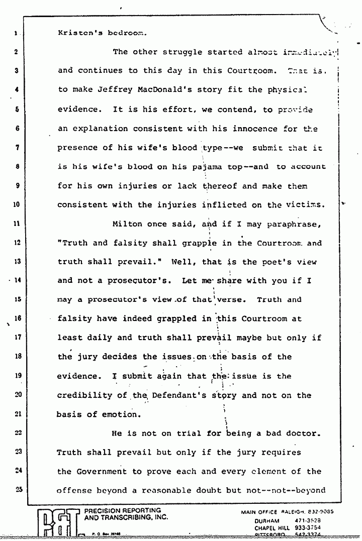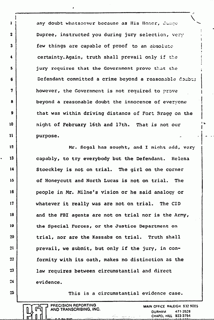 Mr. Segal has sought, and I might add, very capably, to try everybody but the Defendant. Helena Stoeckley is not on trial. The girl on the corner of Honeycutt and North Lucas is not on trial. The people in Mr. Milne's vision, or he said analogy, or whatever it really was, are not on trial. The CID and the FBI agents are not on trial, nor is the Army, the Special Forces, or the Justice Department on trial, nor are the Kassabs on trial. Truth shall prevail, we submit, but only if the jury, on conformity with its oath, makes no distinction as the law requires between circumstantial and direct evidence.