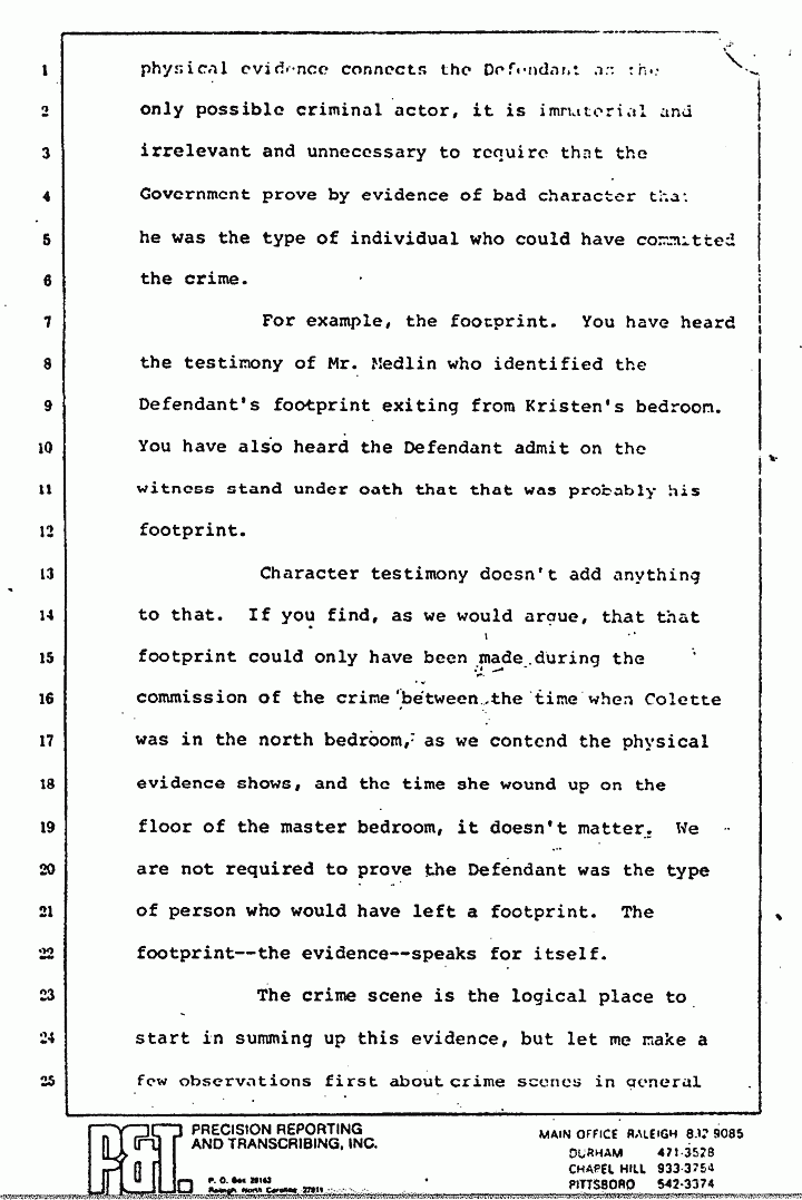 Character testimony doesn't add anything to that. If you find, as we would argue, that that footprint could only have been made during the commission of the crime between the time when Colette was in the north bedroom, as we contend the physical evidence shows, and the time she wound up on the floor of the master bedroom, it doesn't matter. We are not required to prove the Defendant was the type of person who would have left a footprint. The footprint -- the evidence -- speaks for itself.